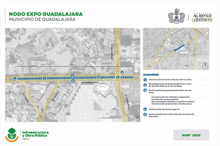 La Secretaría de Infraestructura y Obra Pública (SIOP) dio a conocer los detalles del proyecto Nodo Expo Guadalajara, una intervención urbana que busca mejorar la movilidad y la seguridad en uno de los cruces más transitados de la ciudad.El plan contempla la construcción de un túnel vehicular de cuatro carriles, así como la reconfiguración de las fases semafóricas en los cruces de las avenidas Mariano Otero y Las Rosas. Además, incluye la construcción de un paso peatonal sobre la losa del túnel, la creación de cruces seguros y la pavimentación de carriles laterales con concreto hidráulico. De acuerdo con el proyecto, el túnel tendrá una longitud aproximada de 540 metros. Su trazo iniciará a la altura del hotel Sheraton Guadalajara Expo y concluirá cerca del Expo Hotel Guadalajara, con el objetivo de agilizar la circulación vehicular en esta zona. El director general de Arquitectura y Urbanismo de la SIOP, Douglas Rodríguez Perea, señaló que el inicio de las obras está previsto para octubre o hacia finales de este año, con un tiempo estimado de ejecución que podría ir de nueve meses a un año."Es un proyecto que tiene como objetivo mejorar no sólo la imagen urbana de ese punto tan importante, sino también para resolver un cruce muy utilizado tanto vehicular como peatonalmente", explicó.El funcionario agregó que, además de mejorar la imagen urbana y reforzar la seguridad, el proyecto permitirá una mejor conexión entre el recinto ferial y las avenidas que lo rodean.En este punto también se contempla el trazo de la futura Línea 5, que se proyecta como una extensión desde el parque Agua Azul hasta el entronque de la avenida Mariano Otero con la avenida López Mateos.La intervención urbana se desarrollará por etapas y se integrará con otros proyectos en la zona. En una primera fase se realizarán trabajos preliminares para la estructura del paso a desnivel, mientras que posteriormente se ejecutarán las acciones relacionadas con la imagen urbana."La solución funcional es hacer mucho más seguro y eficiente el cruce vehicular y peatonal de Las Rosas con Mariano Otero, pero nuestro objetivo central es crear un espacio público en esta conexión", precisó.Por ahora, el monto de inversión del proyecto aún no está definido, ya que dependerá de los alcances que se determinen en cada una de las etapas.Para poder arrancar la obra, previamente se realizaron diversos estudios técnicos, entre ellos de geotecnia, obras inducidas, instalaciones pluviales, sanitarias y eléctricas, así como análisis de impacto ambiental y de tráfico, entre otros."La siguiente etapa será empezar a ejecutar una primera fase del proyecto que será a finales del año", precisó.Finalmente, el funcionario estatal subrayó que esta intervención busca dignificar los espacios públicos de la ciudad y mejorar la experiencia urbana en la zona.Días atrás, el gobernador de Jalisco, Pablo Lemus Navarro, anunció que los trabajos en la avenida Mariano Otero, a la altura de Expo Guadalajara, comenzarían hacia finales de octubre de este año.El mandatario estatal destacó que el proyecto plantea priorizar la movilidad peatonal sobre la avenida de Las Rosas, donde la circulación vehicular se mantendrá a baja velocidad con el objetivo de garantizar cruces más seguros. Actualmente, el tránsito entre los hoteles y Expo Guadalajara representa un riesgo para los peatones, situación que se busca corregir con esta intervención.Por su parte, el presidente de Expo Guadalajara, José Andrés Orendain De Obeso, informó que el proyecto de construcción de puentes peatonales se pondrá en pausa para analizar cómo integrarlo con la propuesta del Gobierno del Estado."Ahorita nosotros estamos trabajando internamente un estudio de necesidades para identificar operativamente qué cantidad y qué tipo de espacios podríamos requerir dentro de este proyecto, entonces me parece que es oportuno coordinar los esfuerzos para tener un proyecto con una visión de distrito más integral", dijo.MF
