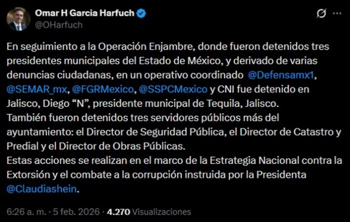 "En seguimiento a la Operación Enjambre, donde fueron detenidos tres presidentes municipales del Estado de México, y derivado de varias denuncias ciudadanas, en un operativo coordinado @Defensamx1, @SEMAR_mx, @FGRMexic, @SSPCMexico y CNI fue detenido en Jalisco, Diego "N", presidente municipal de Tequila, Jalisco", dijo Omar García Harfuch, secretario de Seguridad y Protección Ciudadana de México.