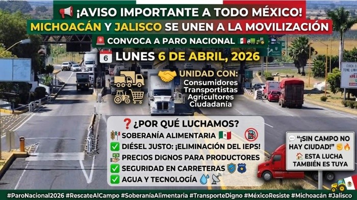 El Frente Nacional para el Rescate del Campo Mexicano (FNRCM) publicó en sus redes sociales que Jalisco y Michoacán se han unido a la movilización y al paro carretero programados para el lunes 6 de abril.Por los mismos canales, el FNRCM anunció la participación de productores de Tamaulipas y Tlaxcala.En mensajes anteriores, la organización había informado que, tras la reunión con Carlos Augusto Morales López, secretario particular de la presidenta Claudia Sheinbaum, realizada el pasado miércoles, se acordó recibir una respuesta del Gobierno el sábado 4 de abril, que analizarían en función de “acuerdos reales” que podrían llevar a posponer la marcha.Sin embargo, ayer no hubo mención a esa respuesta y, por el contrario, se insistió en la movilización convocada para el lunes.Transportistas de Jalisco afiliados a la Confederación Nacional de Transportistas Mexicanos (Conatram) y a la Cámara Nacional del Autotransporte de Carga (Canacar) descartaron participar en el bloqueo anunciado para el próximo lunes por la Asociación Nacional de Transportistas (ANTAC) y el FNRCM.No obstante, su ausencia no libra a Jalisco de las manifestaciones, pues los gremios convocantes han asegurado que habrá participación de productores agrícolas del estado.El paro nacional contempla cierres en carreteras y accesos estratégicos a la Ciudad de México y otras entidades del país desde las 7:00 horas del lunes.Las organizaciones advirtieron posibles bloqueos en las siguientes carreteras:También se plantean bloqueos en Jalisco, Michoacán, Sonora, Sinaloa y Zacatecas, así como en cruces fronterizos como Ciudad Juárez.David Estévez, presidente nacional de la ANTAC, señaló como exigencias prioritarias:Eraclio Rodríguez, uno de los dirigentes del FNRCM, informó que hay cuatro puntos pendientes tras las negociaciones:Ambos sectores también demandan la eliminación del Impuesto Especial sobre Producción y Servicios (IEPS) en el diésel.