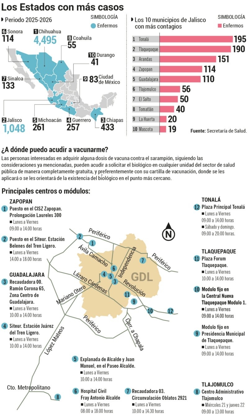 Jalisco enfrenta actualmente un brote de sarampión que ha encendido las alertas sanitarias, particularmente en los municipios de Tonalá y Tlaquepaque, que concentran el mayor número de casos confirmados en el Estado. Lejos de minimizar el escenario, las autoridades reconocen que se trata del brote más importante registrado en años recientes, pero ya se despliega una estrategia reforzada para contenerlo.El secretario de Salud, Héctor Raúl Pérez Gómez, informó que la respuesta institucional se ha intensificado con nuevas acciones de campo. Destaca la ampliación de brigadas de vacunación que recorrerán colonias identificadas como de mayor riesgo en la Zona Metropolitana de Guadalajara. Para ello, se contrató de manera emergente a un centenar de trabajadores de la salud, quienes se sumarán a pasantes, prestadores de servicio social y personal reconvertido de otras áreas. A este esfuerzo se suma una colaboración inédita con la Secretaría de la Defensa Nacional, cuyo personal participará en las brigadas para multiplicar la capacidad operativa. Las acciones forman parte de los llamados cercos epidemiológicos, una estrategia que busca frenar la propagación del virus mediante vacunación intensiva en los puntos con mayor incidencia, sumándose Zapopan y Arandas.“El dinamismo de un brote de este tipo obliga a ajustar las estrategias todos los días”, explicó Pérez Gómez, quien precisó que el objetivo es mitigar la transmisión en un plazo máximo de 90 días, aunque la meta operativa es lograrlo en el próximo mes. Por ahora, descartó la suspensión generalizada de clases, aunque insistió en que la vacunación es la herramienta más eficaz para cortar la cadena de contagios.Camila González, una adolescente que enfermó en noviembre pasado, describe la experiencia como “dos semanas insoportables”. Fiebre persistente, insomnio y una comezón intensa marcaron sus días. Otro testimonio refleja la preocupación en las comunidades escolares. Carmen, madre de familia en Tlaquepaque, consideró acertada la decisión de cerrar temporalmente un plantel tras detectarse contagios. Su hijo no estaba vacunado y el temor creció con cada noticia del brote. Por eso pide acciones contundentes a la autoridad.Las autoridades sanitarias reconocen que el brote se explica, en parte, por rezagos acumulados en la cobertura de vacunación, además del aumento de reuniones sociales y la relajación de medidas preventivas durante el cierre de año. Actualmente, Jalisco dispone de más de un millón de dosis disponibles. Aunque encabeza los contagios recientes a nivel nacional, el mensaje oficial insiste en que hay capacidad de respuesta, vacunas suficientes y una estrategia en marcha. El reto, coinciden autoridades y especialistas, no es el abasto, sino lograr que la población acuda a vacunarse y cierre la puerta al sarampión. Camila González padeció sarampión en noviembre pasado, cuando, piensa, se contagió en su trabajo. Nunca había padecido la enfermedad de pequeña, pero a los 16 años, afirma, han sido las dos “peores semanas de mi vida”. No salió de su cuarto, la comida se la llevaba su mamá a la cama y todas las noches, especialmente durante la primera semana, sufría de insomnio debido a la fiebre que no cedía y a la comezón que originaba el salpullido, sobre todo en los brazos y piernas. “Los primeros días con sarampión son insoportables... no puedes dormir, no puedes estar acostada ni quieta en un solo lugar porque te sientes incómoda. Te duelen las piernas, los brazos, la cabeza. Te sientes muy débil y la comezón también es insoportable, y lo peor es que si te rascas te quedan las cicatrices. Te dan una crema para aliviar la hinchazón y la comezón, pero a mí no me sirvió. De verdad que han sido las dos peores semanas”, dijo. La segunda semana, aunque ya con menos síntomas y sin fiebre, aún sufría de insomnios, dolor de cabeza, sensación de debilidad, falta de apetito y falta de sueño. Para Camila, el salpullido, la incomodidad y el dolor de cabeza, son “lo peor del sarampión”.“Tener sarampión fue horrible. Muchos compañeros en la escuela contaban cómo era tenerlo, pero no crees y no los entiendes hasta que de verdad estás en tu cama sin poder dormir y llorando del dolor y la comezón que sientes en el cuerpo”, concluyó. Por otra parte, cerrar la escuela y mandar a los estudiantes a su casa para tomar clases presenciales fue la mejor decisión que pudieron tomar las autoridades educativas, municipales y estatales, refirió Carmen, madre de familia del plantel educativo en Tlaquepaque que fue clausurado en octubre pasado tras registrarse el primer brote de sarampión al interior de una escuela en el Área Metropolitana de Guadalajara. Su hijo, en sexto grado de primaria, no está vacunado contra la enfermedad, por lo que la preocupación y el temor de su madre crecía conforme pasaban los días. “Nos dio miedo porque los niños no están vacunados y fue algo nuevo, porque hace muchos años que no sucedía esto (un brote de sarampión en las escuelas). Fue algo muy desconcertante”, dijo.Al regreso a clases presenciales, Carmen vigilaba estrictamente las medidas de salubridad impuestas por las autoridades educativas: uso de cubrebocas en todo momento y revisión de manos y boca por alguna señal de sarampión. Además, ante la mínima sospecha, como gripa o calentura, era recomendable no llevar al menor a la escuela. Por lo pronto, autoridades del plantel enfatizaron en que la vigilancia ha sido permanente y todos los días se hacen chequeos de los alumnos para descartar un nuevo brote de sarampión. Una de ellas, quien prefirió mantener el anonimato, recuerda que fueron dos semanas de trabajo intenso y de sanitización de las instalaciones a fin de garantizar la seguridad de la comunidad educativa. A partir del análisis de la cobertura de vacunación en Jalisco y del comportamiento reciente del brote de sarampión, la Secreta