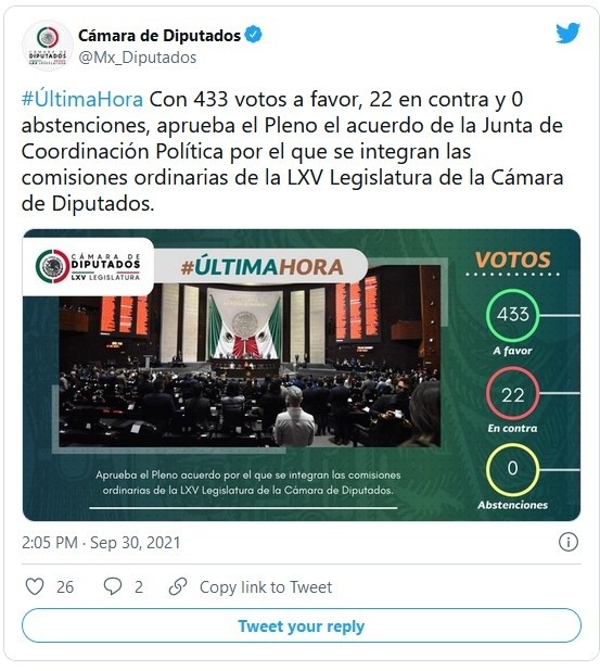 Con 433 votos a favor de Morena, PT, Verde, PAN, PRI y PRD y 22 en contra de Movimiento Ciudadano, el pleno de la Cámara de Diputados aprobó la integración de las 51 comisiones ordinarias que estarán vigentes en la 65 Legislatura.Esta aprobación se dividió en dos: en un primer paquete se avalaron 40 comisiones ordinarias, las cuales ya existen desde la pasada Legislatura, y en el segundo paquete se avalaron las otras 11 que son de nueva creación o se dividieron.Este acuerdo entrará en vigor y está condicionado a que el Senado apruebe la minuta de la reforma al artículo 39 de la Ley Orgánica del Congreso General de los Estados Unidos Mexicanos, por el cual se modifica el número de comisiones ordinarias, aprobado por el pleno de San Lázaro el pasado 23 de septiembre.Los presidentes de las 51 comisiones ordinarias de la 65 Legislatura serán Erasmo González (Morena), quien presida Presupuesto; Luis Armando Melgar (Verde), quien encabece Hacienda; Alejandro Moreno (PRI), Gobernación; y Graciela Sánchez (Morena) quien estará al frente de la de Reforma Político-Electoral.Además, la Comisión de Puntos Constitucionales la encabezará Juan Ramiro Robledo (Morena); la de Cultura, Carlos Francisco Ortiz (Morena); la de Energía, Manuel Rodríguez (Morena); la de Seguridad Ciudadana, Juanita Guerra (Morena); la Jurisdiccional, Jaime Humberto Pérez (Morena); la de Diversidad, Salma Luévano (Morena) y la de Seguridad Social, Angélica Ivonne Cisneros (Morena).Asimismo, la de Marina la presidirá Jaime Martínez López (Morena); Derechos Humanos, Nelly Minerva Carrasco (Morena); Igualdad de Género, Julieta Kristal Vences (Morena); Pesca, María del Carmen Bautista (Morena); Frontera Norte, Teresita de Jesús Vargas (Morena), y Frontera Sur, Ismael Brito (Morena).Asimismo, en la Comisión de Salud, estará Emmanuel Reyes Carmona (Morena); en Recursos Hidráulicos, Rubén Muñoz (Morena); y en Educación, Flora Tania Cruz.?Por el PAN, en Justicia estará Fernando Macías; en Defensa Nacional, Ricardo Villareal; en Transparencia y Anticorrupción, Juan Carlos Romero Hicks; en Comunicaciones y Transportes, Víctor Manuel Pérez; en Desarrollo Urbano y Ordenamiento Territorial, Carmen Rocío González Alonso; en Régimen, Reglamentos y Prácticas Parlamentarias, Sonia Rocha, y en Protección Civil y Prevención de Desastres, Ana María Balderas.Asimismo, el PAN tendrá en Economía, Comercio y Competitividad a Jorge Ernesto Inzunza; en Federalismo y Desarrollo Municipal, a Annia Sarahí Gómez; en Asuntos Migratorios a Rosa María González; en Radio y Televisión a Luis Alberto Mendoza; y en Economía Social y Fomento del Cooperativismo a María de los Ángeles Gutiérrez.Por el PRI, Ana Lilia Herrera presidirá la Comisión de Derechos de la Niñez y Adolescencia; María de Jesús Aguirre, Desarrollo y Conservación Rural, Agrícola y Autosuficiencia Alimentaria; María del Refugio Camarena, Ganadería; Karla Ayala, Juventud; Yericó Abramo, Turismo; y Pablo Guillermo Angulo, Vigilancia de la Auditoría Superior de la Federación.Por el Partido Verde se perfilan para Medio Ambiente y Recursos Naturales, Karen Castrejón Trujillo; para el Deporte, María José Alcalá Izguerra y para Ciencia, Tecnología e Innovación, Javier López Casarín.Por el PT, en la Comisión de Bienestar estará Karina Rojo; en Relaciones Exteriores, Alfredo Femat; en la Comisión de Vivienda, Lilia Aguilar, y en Infraestructura, Reginaldo Sandoval.En el PRD, en las Comisiones de Atención a Grupos Vulnerables, Gabriela Sodi Miranda; y para Cambio Climático, Edna Díaz Acevedo.Por MC, María Elena Limón para Zonas metropolitanas y Salomón Chertorivski en Movilidad.Los integrantes de la Junta de Coordinación Política (Jucopo) acordaron por unanimidad solicitar a la Mesa Directiva de la Cámara de Diputados votar en el pleno la integración de 40 comisiones ordinarias.Lo anterior debido a que en la Cámara de Senadores se pospuso la discusión y creación de cinco nuevas comisiones de la Cámara de Diputados, así como de otras 6 que tuvieron modificaciones en sus nombres.La sesión de hoy tenía previstas dos efemérides con motivo del Día Nacional del Maíz y del Aniversario del Asalto al Cuartel Madera en Chihuahua, y posteriormente una ronda para presentar iniciativas.Con la petición, la integración de la Comisión será el tema fuerte de esta sesión.Al respecto, el vicecoordinador del Partido del Trabajo (PT), Gerardo Fernández Noroña, consideró que el "freno" que se puso en el Senado es una "descortesía"."Me parece una descortesía, somos pares, respetamos las decisiones que toma el Senado para su funcionamiento y nosotros haremos lo propio y vamos a funcionar con 51 comisiones, entonces la verdad desconozco por qué tomaron esa determinación", aseveró.Si te interesó esta noticia y quieres saber más, entonces descarga y descubre INFORMAPlus, la aplicación digital de EL INFORMADOR, en donde tenemos contenidos exclusivos, seleccionados por nuestros editores, para darles una experiencia más completa a los lectores. Si eres suscriptor de EL INFORMADOR tu acceso está incluido, solicítalo al 33 3678-7777.Descarga la aplicación y pruébala GRATIS por treinta días.Para iOS: https://apple.co/35jaVgbPara Android: https://bit.ly/3gwVSEVJM