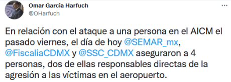 El secretario de Seguridad Ciudadana de la Ciudad de México, Omar Garcia Harfuch, informó hoy domingo que fueron detenidas cuatro personas implicadas en la balacera registrada el pasado viernes en inmediaciones del Aeropuerto Internacional de la Ciudad de México (AICM).A través de sus redes sociales, Garcia Harfuch detalló que dos de los detenidos son responsables directos de la agresión en contra del empresario y su acompañante.Además, el secretario de Seguridad Ciudadana señaló que elementos de la Marina, Fiscalía General de Justicia de la Ciudad de México y de la Secretaría de Seguridad Ciudadana fueron quienes detuvieron a los cuatro presuntos delincuentes.La mañana del viernes pasado, el empresario restaurantero, Eduardo Beaven Magaña y un acompañante fueron atacados a balazos por sujetos armados, quienes interceptaron la camioneta en la que viajaban con destino al Aeropuerto de la CDMX; sin embargo, su escolta repelió la agresión e hirió de gravedad a uno de los delincuentes, quien tiempo después, mientras recibía atención médica en el hospital, murió.El ataque desató intensa movilización de policías y cuerpos de rescate debido a la balacera que se registró en el Circuito Interior y terminó en las inmediaciones de la Terminal 2 del AICM.La tarde del viernes se publicaron varios videos donde se puede ver cómo comenzó la balacera en el Aeropuerto, además hay otro material en el que se observa cómo un sujeto graba al presunto delincuente que terminó tendido en el suelo tras la agresión del escolta.Ambos videos fueron compartidos por el periodista Carlos Jiménez en sus redes sociales.