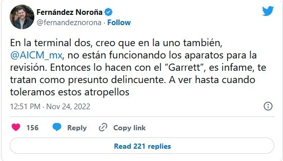 Los aparatos con que se revisa a pasajeros en el Aeropuerto Internacional de la Ciudad de México (AICM) están presentando fallas, por lo que el personal de seguridad está empleando detectores de metal de mano de la marca "Garrett", de acuerdo con un tuit del diputado petista Gerardo Fernández Noroña. A consideración del legislador, se trataría de una medida "infame", puesto que sería propia del trato que se brinda a los supuestos delincuentes."En la terminal dos, creo que en la uno también, @AICM_mx, no están funcionando los aparatos para la revisión. Entonces lo hacen con el 'Garrett', es infame, te tratan como presunto delincuente. A ver hasta cuándo toleramos estos atropellos", escribió el diputado federal en sus redes sociales.Como respuesta a la publicación de Fernández Noroña, algunos usuarios de Twitter han considerado que los empleados de la terminal aérea sólo estarían cumpliendo con su deber, con comentarios como "no los culpo, cumplen con su trabajo", y "déjalos hacer su trabajo". Mientras que otros han ironizado al mencionar el Aeropuerto Internacional Felipe Ángeles (AIFA), mediante opiniones como "pues vuele por el AIFA, esa obra tan genial de ingeniería según el inquilino del Palacio Nacional", y "vete en camión".JM