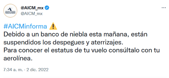 Las malas noticias para todos los usuarios que buscaban viajar desde el Aeropuerto Internacional de la Ciudad de México (AICM) llegaron desde muy temprano hoy viernes, y es que los despegues y aterrizajes se suspendieron debido a un banco de niebla.En la cuenta de Twitter del AICM explicaron lo siguiente: "Debido a un banco de niebla esta mañana, están suspendidos los despegues y aterrizajes. Para conocer el estatus de tu vuelo consúltalo con tu aerolínea".También sugirieron a los usuarios que para conocer el estatus de sus vuelos consulten de manera directa con su aerolínea.Los usuarios han externado que tienen hasta una hora esperando que las condiciones climatológicas cambien para poder volar, sin embargo, hasta esta fecha, los vuelos siguen suspendidos.GC