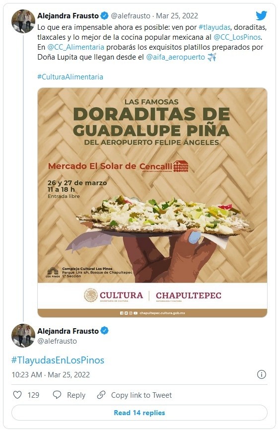 Alejandra Frausto, secretaria de Cultura, anunció que Guadalupe Piña, la señora que fue captada vendiendo tlayudas en la inauguración del Aeropuerto Internacional Felipe Ángeles (AIFA), venderá sus productos en el Centro Cultural Los Pinos durante este fin de semana.A través de su cuenta de Twitter, la funcionaria indicó que Guadalupe Piña estará en el mercado El Solar de Cencalli, en Los Pinos, de 11:00 a 18:00 horas, este 26 y 27 de marzo."Lo que era impensable ahora es posible: ven por #tlayudas, doraditas, tlaxcales y lo mejor de la cocina popular mexicana al @CC_LosPinos. En @CC_Alimentaria probarás los exquisitos platillos preparados por Doña Lupita que llegan desde el @aifa_aeropuerto", indicó la funcionaria en sus redes.El lunes, a la inauguración del AIFA se sumaron diferentes vendedoras, entre ellos estaba doña Lupita, quien ofertó tlayudas en una de las salas del aeropuerto. Al darse a conocer esa situación, surgieron diferentes comentarios.Al día siguiente, el Presidente Andrés Manuel López Obrador (AMLO) dijo: "Eso es México, por eso una señora vendiendo tlayudas, que no eran tlayudas, en un aeropuerto lo ven como algo extraordinario, como algo indebido".JM