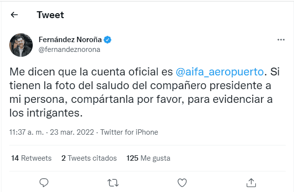 Después de que se viralizó un video del 21 de marzo donde supuestamente el Presidente Andrés Manuel López Obrador (AMLO) ignoró a Gerardo Fernández Noroña durante la inauguración del Aeropuerto Internacional Felipe Ángeles (AIFA), el diputado aclaró que fue saludado.El diputado del Partido del trabajo indicó por medio de las redes sociales que es "absolutamente falso" y una "intriga" que AMLO no lo haya saludado. "Eso es absolutamente falso. Es una intriga, tanto el compañero presidente López Obrador, como Beatriz Gutiérrez Müller me saludaron muy cálidamente. De hecho, por razones obvias, el compañero presidente estaba muy feliz", señaló el aspirante presidencial en redes sociales.Agregó que el saludo lo presenciaron "testigos de calidad" como los gobernadores Rutilio Escandón, de Chiapas, y Víctor Castro, de Baja California Sur, además de que "atrás observaba Carlos Slim".Fernández Noroña pidió a quienes manejan las redes sociales del AIFA que compartan fotos del saludo, si lo tienen, "para evidenciar a los intrigantes".Twitter / @fernandeznorona"La derecha como siempre, mintiendo: #ezdequeloinoro. Eso lo único que significa es que les súper ardió la recepción que me dio la gente en el AIFA y, la calidez que me dispensó el compañero Presidente López Obrador", indicó el legislador en otro mensaje en redes sociales. Twitter / @fernandeznoronaIG