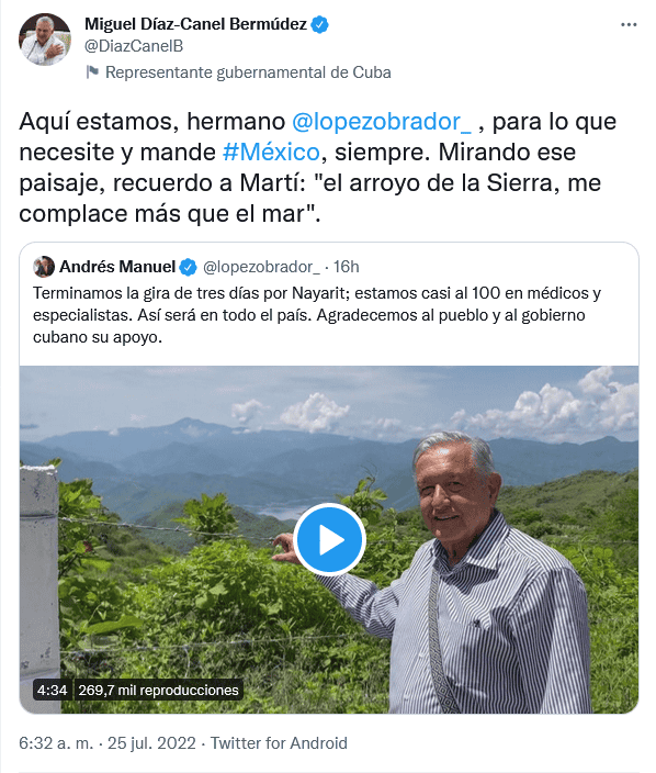 Luego que el Presidente Andrés Manuel López Obrador agradeciera al gobierno de Cuba el envío de 500 médicos de ese país a México, que hoy lunes inician en el estado de Nayarit, el mandatario Miguel Díaz-Canel aseguró que la isla siempre estará para lo que necesite y mande México.En su cuenta de Twitter, el ejecutivo cubano escribió: "Aquí estamos, hermano Andrés Manuel López Obrador, para lo que necesite y mande México, siempre. Mirando ese paisaje, recuerdo a Martí: 'el arroyo de la Sierra, me complace más que el mar'", escribió en la red social.El sábado, en Rosamorada, Nayarit, el Presidente López Obrador aseguró que pese a "los reaccionarios" seguirá contratando médicos de Cuba, así como de Estados Unidos, Rusia, Francia y Japón, porque la salud no es un tema de ideologías, sino de derechos humanos.Al supervisar el avance del programa IMSS-Bienestar, en el hospital de este municipio donde el lunes comenzarán a trabajar 12 médicos cubanos, López Obrador dijo que él tomó la decisión contratar a 500 médicos de porque en el país "no tenemos los médicos que necesitamos."Yo tomé la decisión de que contrataron médicos especialistas del extranjero y van a venir médicos de Cuba. ¿Saben por qué? Porque la salud no tiene que ver con ideologías, la salud tiene que ver con los derechos humanos, y si hay que traerlos de Estados Unidos y de Rusia o de Cuba o de Japón o de Francia los vamos a tener aquí".OF