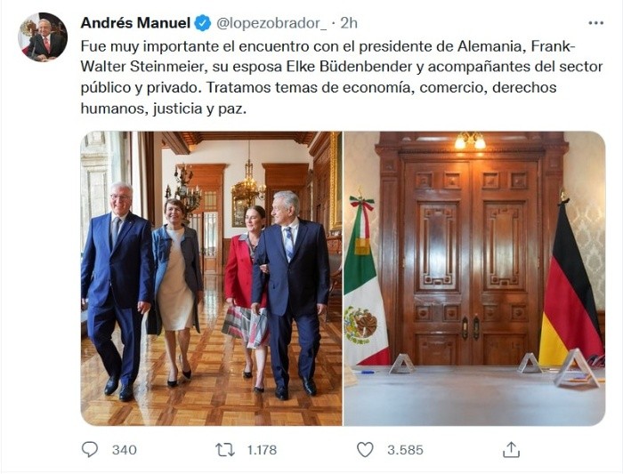 El Presidente Andrés Manuel López Obrador informó que en la reunión que sostuvo este martes por la tarde con su homólogo de Alemania, Frank-Walter Steinmeier, trató temas de economía, comercio, derechos humanos, justicia y paz.En su cuenta de Twitter, el Presidente calificó como "muy importante" este encuentro en Palacio Nacional con el mandatario alemán, su esposa Elke Büdenbender y acompañantes del sector público y privado."Fue muy importante el encuentro con el presidente de Alemania, Frank-Walter Steinmeier, su esposa Elke Büdenbender y acompañantes del sector público y privado. Tratamos temas de economía, comercio, derechos humanos, justicia y paz", escribió en la red social.Al finalizar su encuentro con el Presidente López Obrador y al salir de Palacio Nacional, Frank-Walter Steinmeier, caminó, resguardado por una docena de elementos de seguridad, al restaurante "La casa de las sirenas", ubicado en la calle de Guatemala, ubicado a unos pasos del Templo Mayor."Do you like Mexico?", se le preguntó en su camino. "Yeah, is wonderful (Sí, es maravilloso)", respondió.JM