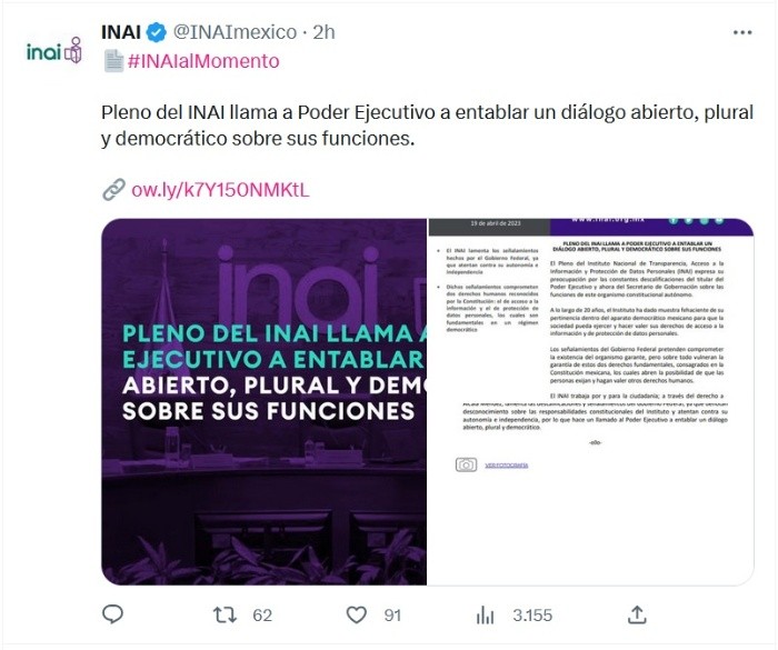 El Pleno del Instituto Nacional de Transparencia, Acceso a la Información y Protección de Datos Personales (Inai) expresó su preocupación por las recientes declaraciones del Presidente Andrés Manuel López Obrador y del secretario de Gobernación, Adán Augusto López, mismas que calificaron como "constantes descalificaciones"."El Pleno del Inai, conformado actualmente por la Comisionada Presidenta Blanca Lilia Ibarra Cadena; las Comisionadas Josefina Román Vergara y Norma Julieta del Río Venegas, y el Comisionado Adrián Alcalá Méndez, lamenta las descalificaciones y señalamientos del Gobierno federal, ya que denotan desconocimiento sobre las responsabilidades constitucionales del Instituto y atentan contra su autonomía e independencia, por lo que hace un llamado al Poder Ejecutivo a entablar un diálogo abierto, plural y democrático", expusieron a través de un comunicado.Luego de que López Obrador asegurara que dicho Instituto es un "cero a la izquierda", las y los integrantes señalaron que a lo largo de 20 años, "el Inai ha dado muestra fehaciente de su pertinencia dentro del aparato democrático mexicano para que la sociedad pueda ejercer y hacer valer sus derechos de acceso a la información y de protección de datos personales".Advirtieron que los señalamientos del Gobierno federal pretenden comprometer la existencia del organismo garante, "pero sobre todo vulneran la garantía de estos dos derechos fundamentales, consagrados en la Constitución mexicana, los cuales abren la posibilidad de que las personas exijan y hagan valer otros derechos humanos".Las y los comisionados afirmaron en el comunicado que el Inai trabaja por y para la ciudadanía."A través del derecho a saber, las personas han podido conocer y acceder a programas sociales, a servicios de salud o a becas y, mediante el derecho de protección de datos, han logrado obtener sus semanas cotizadas para tramitar su pensión, solicitar su expediente clínico para conocer otras valoraciones médicas, rectificar sus datos, por ejemplo, de los certificados de vacunación, presentar una denuncia cuando instancias públicas o privadas hacen mal uso de su información personal y exigir la reparación del daño cuando han sido víctimas de robo o suplantación de identidad, por mencionar algunos beneficios", indicaron.Además, continuaron, a través de las resoluciones del Pleno del Inai, derivadas del ejercicio del derecho de acceso a la información, se han documentado y transparentado diversos asuntos de interés público y casos como Segalmex, la "Estafa Maestra" o la "Casa Blanca"."Por otro lado, es importante puntualizar que el Inai es la única autoridad en el país facultada para velar por el derecho de la sociedad a la protección de sus datos personales, a nivel nacional, en el sector privado y, en el ámbito federal, en el sector público", concluyeron.JM