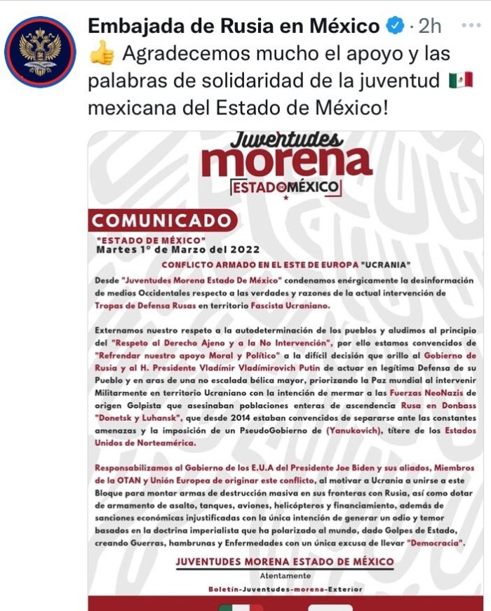 La embajada de Rusia en México agradeció en su cuenta de Twitter el respaldo y la solidaridad supuestamente por parte jóvenes del Estado de México militantes de Morena.En el mensaje de redes sociales añadieron el comunicado de Juventudes Morena Estado de México y señalaron: "Agradecemos mucho el apoyo y las palabras de solidaridad de la juventud mexicana del Estado de México!"."Condenamos enérgicamente la desinformación de medios Occidentales respecto a las verdades y razones de la actual intervención de Tropas de Defensa Rusas en territorio Fascista Ucraniano", comentaron.En el documento, que habría enviado Juventudes Morena, señalaron su apoyo y respeto a la decisión tomada por el gobierno de Rusia, luego de que Vladimir Putin, invadiera Ucrania."Estamos convencidos de 'Refrendar nuestro apoyo Moral y Político' a la difícil decisión que orilló al Gobierno de Rusia y al H. Presidente Vladímir Vladímirovich Putin de actuar en legítima Defensa en de su Pueblo", se lee en el comunicado del que se desconoce la autenticidad.En el documento, firmado por supuestos seguidores del partido de Andrés Manuel López Obrador (AMLO) también se señala al presidente de Estados Unidos, Joe Biden, y a la OTAN como responsables de generar el conflicto.