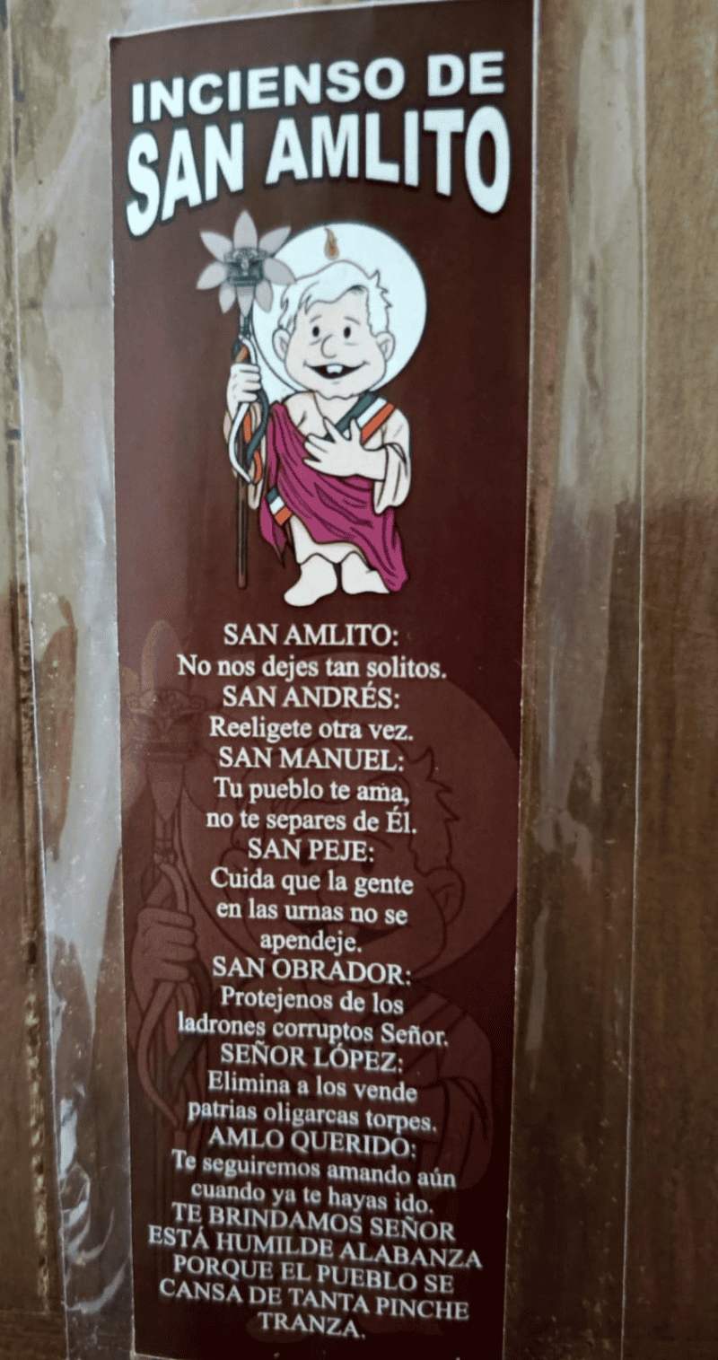 A casi cinco meses de haber dejado la Presidencia y retirarse a su quinta en Palenque, Chiapas, Andrés Manuel López Obrador sigue siendo una figura popular en la venta de mercancía en el Centro Histórico de la Ciudad de México.Además de encontrarse en tazas, playeras, llaveros, muñecos, fotografías, sandalias, calcetas e incluso inciensos, ahora su imagen ha sido transformada en una figura de santo.Bajo el nombre de “San AMLITO”, esta escultura es promocionada como “el santo del pueblo” y se comercializa frente a la Catedral Metropolitana, a pocos pasos de Palacio Nacional.Ataviado con una imagen similar a la de San Judas Tadeo, San AMLITO es representado con una imagen caricaturizada del exmandatario descalzo, con una túnica blanca que es atravesada por una especie de banda presidencial y cargando en su mano izquierda una especie de báculo.Los vendedores ambulantes venden las pequeñas imágenes en 200 pesos, el cual es sostenido en una base de madera con la leyenda "San AMLITO".Estos comerciantes afirman que San AMLITO "es el santo del pueblo" y que "es milagroso".La pequeña escultura está hecha de yeso y tiene una altura de 15 centímetros.La imagen es acompañada por una oración a San AMLITO en la cual se le pide su reelección, que no deje abandonada a la población y que proteja a la población de los ladrones y corruptos.En la plegaría también se garantiza que el pueblo mexicano siempre amará al expresidente tabasqueño "aún cuando ya se haya ido"."Te brindaremos señor esta humilde alabanza porque el pueblo se cansa de tanta pinche tranza", finaliza la oración.JM