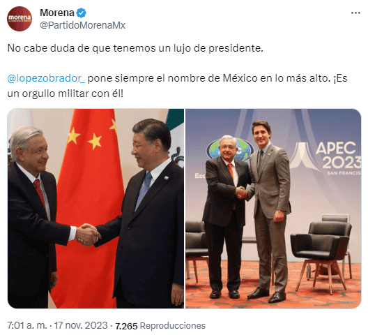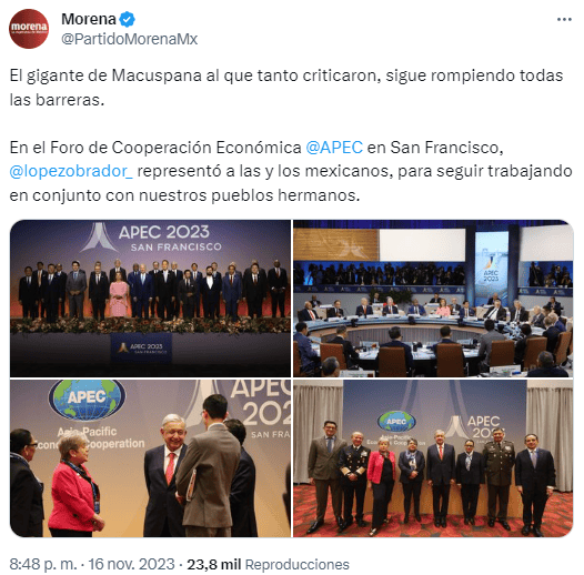 En el marco de la cumbre anual del Foro de Cooperación Económica Asia-Pacífico (APEC) que se celebra en San Francisco, California, Estados Unidos, Morena reconoció al Presidente Andrés Manuel López Obrador como "el gigante de Macuspana" debido a su participación junto a otros líderes mundiales.El partido del Presidente de México lo llamó en redes sociales "El gigante de Macuspana al que tanto criticaron, sigue rompiendo todas las barreras".Morena aseguró que López Obrador representó a las mexicanas y los mexicanos en el Foro "para seguir trabajando en conjunto con nuestros pueblos hermanos"."No cabe duda de que tenemos un lujo de Presidente. López Obrador pone siempre el nombre de México en lo más alto. ¡Es un orgullo militar con él!", agregó en otro mensaje.*Mantente al día con las noticias, únete a nuestro canal de WhatsAppOF