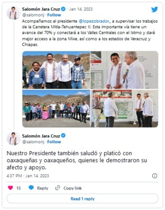 El Presidente Andrés Manuel López Obrador reconoció la labor del exgobernador priista, Alejandro Murat Hinojosa, durante la segunda actividad oficial de su gira por Oaxaca acompañado del mandatario estatal, Salomón Jara Cruz."Nos ayudó mucho Alejandro Murat, el pasado gobernador, se portó muy bien porque no había distinción partidista, como debe de ser, los gobernantes tenemos que atender a todos, escuchar a todos, respetar a todos y el presupuesto público es de todos, no es de ningún partido, nosotros somos simplemente administradores de los dineros del pueblo", dijo.Al término de la presentación del Plan de Apoyo a personas afectadas por el huracán "Agatha", desde Bahías de Huatulco, afirmó que Murat Hinojosa "lo entendió bien" y permitió un avance en Oaxaca; no obstante, calificó al actual gobernador del estado como su "compañero y hermano", pues dijo que llevan muchos años luchando juntos.López Obrador fue recibido desde temprana hora de este sábado por el gobernador Salomón Jara, siendo la primera visita oficial que realiza el Presidente de la República durante la administración estatal del morenista.Como primera actividad, López Obrador supervisó los avances de la carretera Mitla-Tehuantepec, la cual ofrecerá una mejor comunicación vía terrestre con la región del Istmo de Tehuantepec.JM