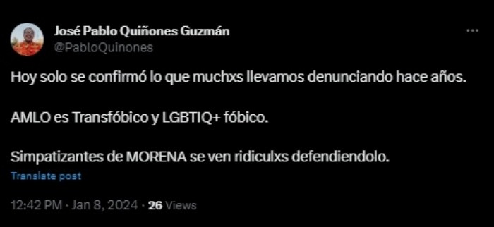 Durante su conferencia matutina de este lunes el Presidente de México Andres Manuel López Obrador se refirió a Salma Luévano, una diputada trans militante de Morena como “un señor vestido de mujer”. Esto sucedió después de que el fin de semana comenzará a circular un video donde ella le saludaba con un beso y él parecía alejarse. Después de que el presidente saludara a la diputada durante el fin de semana, Luévano aseguró en redes sociales que López Obrador sabía que es una mujer trans. Durante la “mañanera” de hoy el presidente mexicano respondió a estas acusaciones. “Criticandome porque le di un beso a un señor vestido de mujer” para continuar diciendo “yo beso a los hombres y me besan, el hombre tiene sentimientos”. En redes sociales se han hecho muchos comentarios al respecto de las declaraciones del presidente y diferentes colectivos LGBT, así como personas de la comunidad han señalado la transfobia del comentario del mandatario. Victoria Sámano, fundadora de LLECA - Escuchando la calle, una organización conformada por personas lgbt+ que brinda atención integral a personas lgbt+ y mujeres que se encuentran en situación de calle o en condiciones de riesgo, comentó a través de su cuenta de X. *Mantente al día con las noticias, únete a nuestro canal de WhatsApp aquí: https://whatsapp.com/channel/0029VaAf9Pu9hXF1EJ561i03
