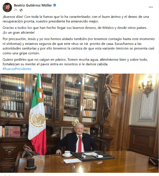 Beatriz Gutiérrez Müller, la esposa del Presidente de México, Andrés Manuel López Obrador (AMLO), informó hoy martes que ella y su hijo están en aislamiento tras el contagio de COVID del Mandatario."Por precaución, Jesús y yo nos hemos aislado también (no tenemos contagio hasta este momento ni síntomas) y estamos seguros de que este virus se irá pronto de casa", escribió en su Facebook Gutiérrez Müller.Esto luego de que AMLO anunciara que está contagiado de COVID por segunda vez, a casi un año de haber contraído por primera vez la enfermedad.El contagio ha causado polémica porque AMLO apareció el lunes en la "mañanera" con síntomas de gripe, después de que la semana pasada rechazó hacerse la prueba de COVID-19 pese a haberse reunido con la secretaria de Economía, Tatiana Clouthier, quien dio positivo el viernes.Gutiérrez Müller, quien es escritora e investigadora, coincidió con su esposo en minimizar la enfermedad."Escuchamos a las autoridades sanitarias y por ello tenemos la certeza de que esta variante ómicron se presenta casi como una gripe común. Quiero pedirles que no caigan en pánico. Tomen mucha agua, aliméntense bien y sobre todo, fortalezcan su mente: el pavor entra en nosotros si le damos cabida", dijo.La infección del presidente ocurre mientras México lidia con la cuarta ola de COVID-19 impulsada por la variante ómicron, con récords de contagios que han superado los 30 mil diarios.México acumula más de 4.1 millones de casos y más de 300 mil muertes, la quinta cifra más alta del mundo.La escritora reportó que "el presidente ha amanecido mejor" con "toda la fuerza que lo ha caracterizado, con el buen ánimo y el deseo de una recuperación pronta"."Gracias a todos los que han hecho llegar sus buenos deseos, de México y desde otros países. ¡Es un gran aliciente!", expresó.GC