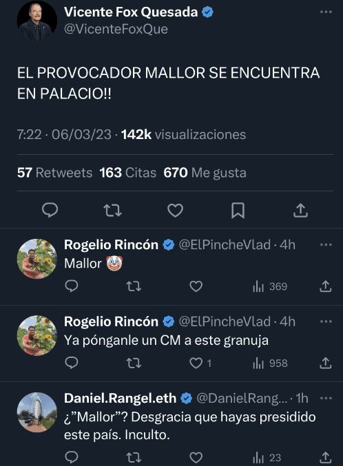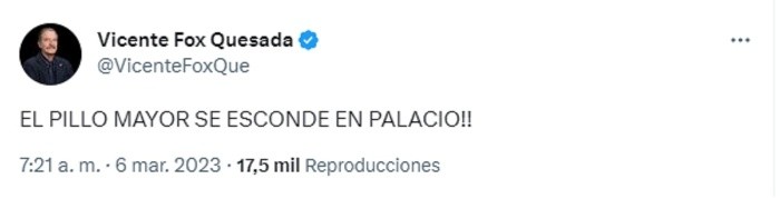 El expresidente de México, Vicente Fox es uno de los políticos que frecuentemente está atacando a la oposición con mensajes que escribe en su cuenta de Twitter, pero principalmente lo hace contra el Presidente de México Andrés Manuel López Obrador, pues considera que desde su llegada a la presidencia solo ha hecho que el país empeore. Desde el fin de semana pasada en la marcha de defensa del INE en CDMX, Vicente Fox ha estado arremetiendo contra el mandatario federal. Ahora, el expresidente comenzó el lunes apoyando a María Eugenia Campos Galván, quien presentó su primer informe de gobierno en Chihuahua. De misma manera lo hizo con Alejandra del Moral, pues está peleando la gubernatura del Estado de México contra Delfina Gómez, quien forma parte del partido de Morena y es apoyada por López Obrador.La candidata del PRI arremetió contra el Presidente y dijo que las elecciones se ganan en la calle y no en Palacio Nacional.“De lo que estoy segura es que las elecciones no se ganan en la oficina ni en el escritorio de Palacio Nacional, se ganan en la calle, se ganan en territorio mexiquense y ahí es donde nos vamos a encontrar", dijo Del Moral. Ante las palabras de la política, Vicente Fox se unió en redes sociales para lanzarse contra López Obrador, sin embargo cometió un grave error, ya que el mensaje que iba dirigido contra el mandatario lo escribió con faltas de ortografía. "EL PROVOCADOR MALLOR SE ENCUENTRA EN PALACIO!!", se lee en el tuit. Los usuarios en redes sociales criticaron y se burlaron de Vicente Fox, pues escribió "Mallor" en lugar de "Mayor".Minutos después, el tuit con el error fue eliminado e inmediatamente publicó otro corrigiendo la falta de ortografía. "EL PILLO MAYOR SE ESCONDE EN PALACIO!!", se lee en el nuevo tuit. Algunas personas respondieron al nuevo mensaje y se burlaron de él porque ya se había equivocado en el tuit anterior que eliminó. MF