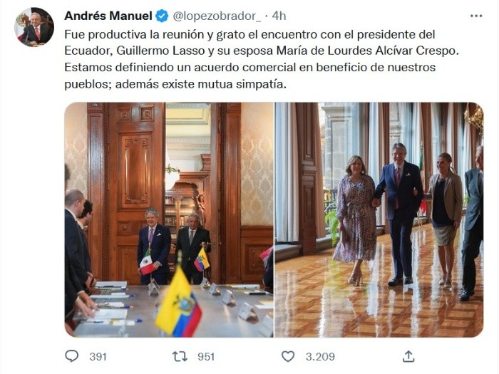 El Presidente Andrés Manuel López Obrador calificó el encuentro de más de cinco horas con su homólogo de Ecuador, Guillermo Lasso Mendoza como "una reunión productiva" y en donde se acordó definir un acuerdo comercial entre ambas naciones."Fue productiva la reunión y grato el encuentro con el presidente del Ecuador, Guillermo Lasso y su esposa María de Lourdes Alcívar Crespo. Estamos definiendo un acuerdo comercial en beneficio de nuestros pueblos; además existe mutua simpatía", escribió el Mandatario federal en su cuenta de Twitter.En un comunicado conjunto, se informó que ambos mandatarios coincidieron en la importancia de avanzar en el proceso de negociación para la suscripción del Acuerdo de Integración Productiva México-Ecuador, por lo que instruyeron a sus equipos negociadores a tener, en el plazo de una semana, una propuesta de beneficio de las dos naciones en los temas relacionados a banano y camarón, que permita, indicaron, el cierre adecuado de la negociación.Además, México reiteró su apoyo para que Ecuador ingrese a la Alianza del Pacífico como miembro de pleno derecho y refrendó su compromiso para que inicie el proceso de adhesión en cuanto se cierre la negociación bilateral."Coincidieron en la importancia de avanzar en el proceso de negociación para la suscripción del Acuerdo de Integración Productiva México-Ecuador, por lo que instruyeron a sus equipos negociadores a tener, en el plazo de una semana, una propuesta de beneficio para los dos países en los temas relacionados a banano y camarón, que permita el cierre adecuado de la negociación.En el comunicado conjunto, los presidentes expresaron su voluntad de fortalecer aún más la relación bilateral, por lo que convinieron celebrar la VII Reunión del Mecanismo de Consulta en Materia de Interés Mutuo México-Ecuador en el primer semestre de 2023 en la Ciudad de México.Se informó que también conversaron sobre los retos de la seguridad a nivel regional y, de manera particular, en ambos países.Además, reiteraron su compromiso de compartir información e intercambio de experiencias en el combate al crimen organizado y en las políticas implementadas para la búsqueda de la paz en cada nación.López Obrador y Lasso Mendoza se congratularon por los avances en materia de cooperación técnica-científica y educativa-cultural, en donde Ecuador reafirmó su interés para intercambiar experiencias de los programas Sembrando Vida y Jóvenes Construyendo el Futuro."El presidente Guillermo Lasso Mendoza agradeció al presidente Andrés Manuel López Obrador por la acogida y las atenciones recibidas junto a su comitiva durante su visita a México, y extendió una invitación al jefe de Estado mexicano a fin de que efectúe una visita oficial al Ecuador", concluye el comunicado conjunto.JM