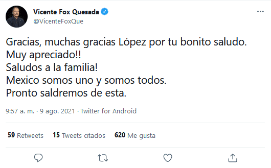 El mandatario de México, Andrés Manuel López Obrador (AMLO) deseó este lunes pronta recuperación al expresidente Vicente Fox y a su esposa, Marta Sahagún, quienes se encuentran hospitalizados tras enfermar de covid-19."Deseo que le vaya muy bien, que se recupere, que se alivie el presidente Fox y su esposa", indicó AMLO durante su “mañanera”, celebrada en la fronteriza Ciudad Juárez, en Chihuahua.El fin de semana, trascendió que Fox, de 79 años y Sahagún, de 68, fueron hospitalizados para ser atendidos tras contagiarse de coronavirus, aunque se encuentran estables pues ninguno de los dos presentaba signos graves de la enfermedad.Tras los buenos deseos, el exmandatario agradeció el gesto de López Obrador en su cuenta oficial de Twitter."Gracias, muchas gracias López por tu bonito saludo. Muy apreciado. Saludos a la familia. México somos uno y somos todos. Pronto saldremos de esta", escribió Fox.Asimismo, López Obrador deseó que María Eugenia Campos, gobernadora electa de Chihuahua, se recupere pues también se contagió de COVID-19."(Campos) no estuvo con nosotros, fue invitada a estar acompañándonos, porque está enferma, tiene COVID, deseo que se recupere, que le vaya muy bien", apuntó AMLO.México vive actualmente un tercer repunte de contagios propiciado por la variante delta y suma más de 2.97 millones de casos y 244 mil 420 decesos. El país ha aplicado 72.1 millones de dosis de vacunas anticovid hasta ahora.GC