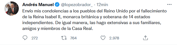El Presidente de México, Andrés Manuel López Obrador, externó sus condolencias al pueblo de Reino Unido por la muerte de la reina Isabel II, a sus 96 años.Luego de que el Palacio de Buckingham confirmara que Isabel murió en el castillo de Balmoral, en Escocia, el Mandatario mexicano escribió en sus redes sociales un mensaje donde lamenta dicho deceso."Envío mis condolencias a los pueblos del Reino Unido por el fallecimiento de la Reina Isabel II, monarca británica y soberana de 14 estados independientes. De igual manera, las hago extensivas a sus familiares, amigos y miembros de la Casa Real", escribió en Twitter.Antes de esto, el canciller de México, Marcelo Ebrard, también envió sus condolencias: "Nuestros pensamientos y condolencias al pueblo y Gobierno del Reino Unido".Isabel II gozó del reinado más longevo en la historia de su país, y uno de los más largos del mundo, tras haber celebrado este mismo año las siete décadas como monarca, su Jubileo de Platino.Con información de EFEGC