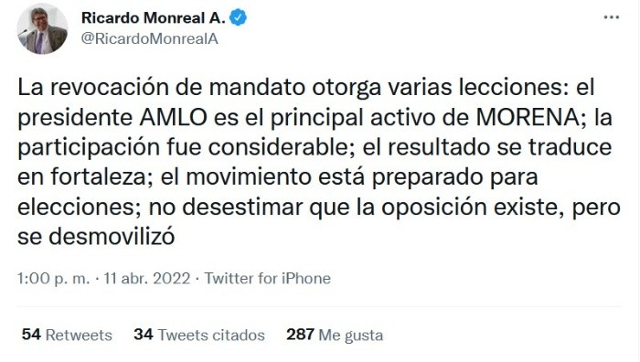 El coordinador de Morena en el Senado de la República, Ricardo Monreal Ávila, declaró que la consulta de revocación de mandato dio varias lecciones al movimiento que encabeza el Presidente de la República, Andrés Manuel López Obrador, la principal de ellas, que el mandatario es el principal activo de Morena.En un mensaje publicado en redes sociales, el también presidente de la Junta de Coordinación Política (Jucopo) afirmó que el Presidente de la República mantiene un alto nivel de aceptación, lo que se demostró en este ejercicio democrático, además de que el simbolismo y liderazgo López Obrador siguen muy fuertes en el país.Monreal Ávila destacó también que la afluencia de votantes en este mecanismo de democracia participativa fue considerable, pues de acuerdo con el Instituto Nacional Electoral (INE) alrededor de 18 millones de mexicanos acudieron a las urnas, lo que coincide con lo que el senador había anticipado: la participación de entre 15 y 20 millones de personas en este ejercicio democrático.El legislador morenista indicó que el resultado de la consulta se traduce en fortaleza, especialmente para el Presidente de la República, "ya que la ciudadanía considera que está realizando un buen trabajo".En su mensaje, el coordinador parlamentario aseguró que el Movimiento de Regeneración Nacional se está preparado para elecciones y pidió no desestimar la existencia de la oposición, aunque reconoció que "está desmovilizada".JM
