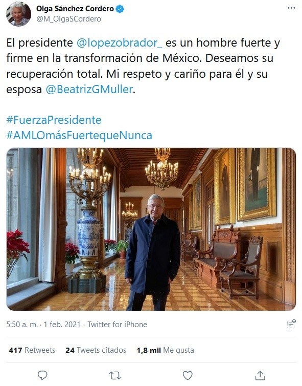 El Presidente Andrés Manuel López Obrador (AMLO) "está bien", "de muy buen ánimo", seguirá aislado otra semana y probablemente regresará a sus funciones completas el próximo lunes, luego de su contagio de coronavirus COVID-19, afirmó este lunes Olga Sánchez Cordero, titular de la Secretaría de Gobernación (Segob).Sánchez Cordero indicó, que AMLO "(está) de muy buen ánimo para lograr su recuperación esta semana, seguramente lo tendremos ya para el lunes de la próxima semana, yo me haré cargo todavía esta semana de las conferencias".Desde Palacio Nacional, en la conferencia "mañanera", Sánchez Cordero criticó los rumores sobre el estado de salud de López Obrador, quien anunció su contagio del causante de la enfermedad de COVID-19 el domingo 24 de enero.Desde el anuncio de su infección, el Gobierno de México avisó que se reservaría los datos clínicos de AMLO por ser "materia de su privacidad", lo que ha generado cuestionamientos en redes sociales sobre su estado de salud.AMLO, quien suele controlar la agenda mediática con sus ruedas de prensa "mañaneras" y mensajes en redes sociales, publicó un video el viernes pasado desde Palacio Nacional para "acallar los rumores", el único mensaje que ha emitido hasta ahora.Antes de eso, sólo subió una fotografía el lunes pasado tras conversar por teléfono con el presidente de Rusia, Vladimir Putin, para negociar dosis de la vacuna Sputnik V."El Presidente está bien, va avanzando en su recuperación, como todos lo vimos el viernes pasado, nos dio muchísimo gusto que nos dirigiera un mensaje, sobre todo para acallar aquellas voces que habían estado circulando algunos temas que no eran para nada veraces", manifestó Sánchez Cordero.Sin detallar su estado de salud, las principales dependencias y funcionarios de alto nivel del Gobierno de México empezaron desde anoche una campaña en redes sociales con las etiquetas #AMLOmásfuertequenunca y #FuerzaPresidente.La titular de la Segob llamó a los medios de información a contribuir con la "estabilidad social", pero insistió en que el vídeo del viernes es la prueba de su buen estado de salud."Lo vimos bien, lo vimos optimista y, desde luego, como todo, a la mitad de este contagio que lamentablemente tuvo, pero en franca recuperación, y no sé ustedes, pero yo lo vi muy optimista", expresó.La enfermedad de AMLO ocurre mientras México acumula más de 1.86 millones de contagios confirmados y más de 158 mil 500 muertes por COVID-19, por lo que la semana pasada rebasó a India como el tercer país con más fallecidos.OA