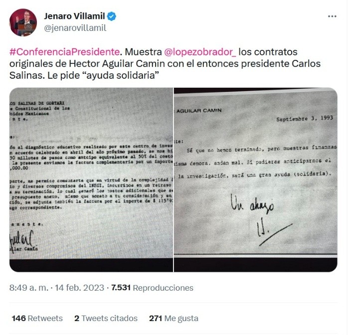 Este martes, el Presidente Andrés Manuel López Obrador reveló cartas en las cuales el escritor Héctor Aguilar Camín le pedía dinero al entonces presidente Carlos Salinas de Gortari (PRI) para realizar sus publicaciones."Pero cuando se enoja Salinas con él, porque se va Héctor con Zedillo, Salinas da a conocer cheques y cartas donde le pedía dinero Aguilar Camín a Salinas para sus publicaciones".En su conferencia "mañanera", el Mandatario exhibió un documento "recibo provisional" por 250 millones de viejos pesos firmado por Aguilar Camín, entonces presidente del Centro de Investigación Cultural y Científica, como primer pago de un estudio "El Desafío Educativo" fechado en abril de 1989.El Presidente señaló que el grupo de Aguilar Camín, junto con empresas españolas, eran los encargados de hacer los libros de texto gratuito.Luego mostró otro documento dirigido al expresidente Salinas, en el cual el escritor le informa que por la complejidad del estudio y compromisos con el Inegi, hubo un retraso de seis meses para su terminación y esto generó costos adicionales por 115 millones de viejos pesos y se adjunta "la factura correspondiente".Así como una tercera nota con el mensaje: "Presidente. Sé que no hemos terminado (el estudio), pero nuestras finanzas por la misma demora, andan mal. Si pudieras anticiparnos el saldo de la investigación será una gran ayuda (solidaria). Abrazo", con fecha de septiembre de 1993.Por último se mostró un cheque de caja por 364 millones de viejos pesos, con fecha de septiembre de 1990, a nombre de Héctor Aguilar Camín.JM