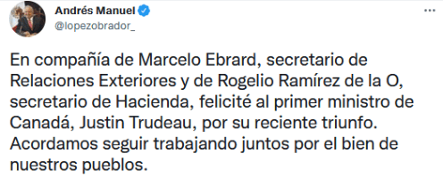 El Presidente de México, Andrés Manuel López Obrador (AMLO), llamó este jueves al primer ministro de Canadá, Justin Trudeau, para felicitarlo por su victoria en las últimas elecciones y lo animó a "seguir trabajando juntos"."En compañía de Marcelo Ebrard, secretario de Relaciones Exteriores y de Rogelio Ramírez de la O, secretario de Hacienda, felicité al primer ministro de Canadá, Justin Trudeau, por su reciente triunfo. Acordamos seguir trabajando juntos por el bien de nuestros pueblos", informó AMLO en las redes sociales.Trudeau se impuso en los comicios celebrados el 20 de septiembre, pero no logró la mayoría absoluta como buscaba tras disolver el Parlamento apenas dos años después de los anteriores comicios. Su Partido Liberal consiguió de forma provisional 158 diputados, 12 menos de la mayoría absoluta en la Cámara Baja del Parlamento, que cuenta con 338 escaños, seguido por el opositor Partido Conservador (PC), que suma 119 diputados. En tercer lugar quedó el soberanista Bloque Quebequés (BQ), que solo presenta candidatos en la provincia francófona de Quebec, con 34 diputados, y el socialdemócrata Nuevo Partido Democrático (NPD) consiguió 25 diputados. Como consecuencia, y dado que apenas ha habido cambios en la representación parlamentaria, Canadá contará tras las elecciones con casi el mismo Parlamento que existía con anterioridad.GC