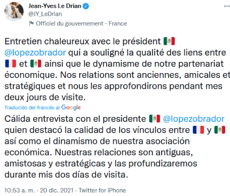 El ministro para Europa y Asuntos Exteriores de Francia, Jean-Yves Le Drian, fue condecorado con la Orden Mexicana del Águila Azteca, en grado de banda, durante la "mañanera" del Presidente de México, Andrés Manuel López Obrador(AMLO).AMLO hizo el reconocimiento a Le Drian de quien destacó "su desempeño en favor de la política exterior, en especial por su trato amistoso, fraterno, con el Gobierno de México y con nuestro pueblo. Por eso vamos a imponer la condecoración del Águila Azteca", dijo.López Obrador aseguró que esto reafirma la cooperación binacional y exaltó la trascendencia que tuvo el canciller francés para la devolución de algunas piezas arqueológicas que ahora se exhiben en el Museo de Antropología e Historia.México y Francia cooperan conforme a los principios históricos de la Revolución francesa, destacó AMLO.Destacó que una empresa francesa acaba de ganar una licitación para construir trenes que se usarán en el Tren Maya, una de las obras más emblemáticas de su Gobierno y afirmó que se trata de una inversión de alrededor de 36 mil millones de pesos.Dijo que una parte importante de esos vehículos se ensamblará en México, por lo que se generarán empleos en el país.Por su parte, Marcelo Ebrard, secretario de Relaciones Exteriores de México, comentó que esta es la más alta distinción que se otorga a extranjeros para reconocer los servicios prominentes brindados a los mexicanos y al mundo.Al recibir la distinción, Le Drian se dijo comprometido a nivel personal con el vínculo entre México y Francia. Además, calificó de vital la amistad entre ambas naciones.Aseveró que México y Francia comparten un mismo ideal de libertad y fraternidad, y recordó que unos 40 mil franceses residen en México, entre empresarios, estudiantes y artistas.El ministro francés está de visita en el país por dos días en las que además de reunirse con López Obrador y Ebrard, viajará a Monterrey, donde inaugurará el nuevo Consulado General de Francia y se entrevistará con el gobernador de Nuevo León, Samuel García.Además asistirá a la firma de dos convenios en el estado con la Universidad Autónoma de Nuevo León (UANL) y aprovechará para promocionar los Juegos Olímpicos de París de 2024.GC