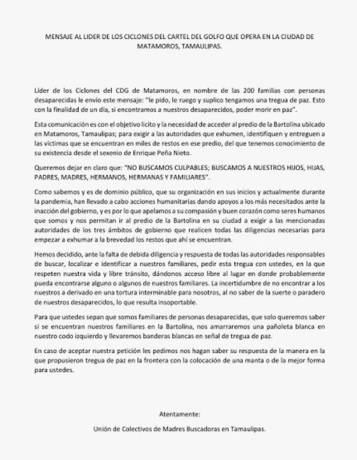 Al manifestar que "no hay en puerta ni un otro plan", el Presidente Andrés Manuel López Obrador rectificó su postura y aseguró que en su gobierno no se busca ni apoya la propuesta de un acuerdo de paz con grupos criminales para evitar más desaparecidos como lo afirmó el martes pasado.En su mañanera de este jueves en las instalaciones de la Primera Región Naval, en Ciudad Madero, Tamaulipas, López Obrador señaló que sus declaraciones fueron hechas en el sentido de que estaba a favor de "cualquier medida que nos permitiera vivir en paz"."La pregunta siempre me pareció tendenciosa, pero no podía yo decir 'fíjense, ni queremos ningún acuerdo con la delincuencia', como decían los otros presidentes; 'no me va a temblar la mano', 'los vamos a derrotar'. Así, esas balandronadas en asuntos tan serios. Yo también, ni modo de decir no tenemos acuerdo ni queremos tenerlo con quien por su propia voluntad decida actuar de manera responsable y humana", declaró el Presidente.Acompañado por su gabinete de Seguridad y por el gobernador Américo Villarreal, López Obrador afirmó que su gobierno seguirá apoyando a las madres buscadoras pues "es nuestra responsabilidad". "No hay en puerta ni un otro plan", expresó."Entonces aclaro eso, y vamos a seguir apoyando a las madres que están buscando a sus hijos, a los familiares, que están buscando a personas desaparecidas, pero es nuestra responsabilidad y no hay en puerta ni un otro plan", agregó.El martes pasado, el Presidente López Obrador expresó su apoyo a la propuesta de Delia Quiroa, integrante de la Unión de Colectivos de Madres Buscadoras, de buscar un pacto de paz con organizaciones criminales para erradicar los casos de desaparición."Todo lo que signifique hacer a un lado o no usar la violencia, lo apruebo", respondió. "Entonces, ¿Usted sí suscribe o se suma a este llamado de las organizaciones criminales para un pacto social para la paz?", se le insistió."Yo sí. Todo lo que signifique hacer a un lado o no usar la violencia, lo apruebo, lo apruebo. Y eso no tiene que ser por demanda. ¿Sí? Sólo de la autoridad, sino es por decisión de los mismos integrantes de estas bandas. Ellos deben de asumir una responsabilidad y comportarse como buenos ciudadanos; o sea, no perderse o pensar que ya no tienen otra opción, otro camino, no. Siempre hay salidas, siempre hay salidas para los que no quieren usar la violencia", respondió.Este fin de semana Delia Quiroa, titular del Colectivo Diez de Marzo y de la Unión de Colectivos de Madres Buscadoras, lanzó un llamado a los líderes de los cárteles mexicanos para establecer un pacto social para prevenir y erradicar la desaparición de personas en México y fomentar la paz.Por medio de un documento, los colectivos piden que la desaparición de personas sea eliminada del territorio nacional tanto por particulares como por las Fuerzas Armadas, por lo que piden ayuda y colaboración de los cárteles Jalisco Nueva Generación, Sinaloa, Del Golfo, Del Norte, Zetas, Vieja Escuela, Los Salazar, Ciudad Juárez, Tijuana, Beltrán Leyva, Caballeros Michoacanos y Caballeros Templarios.vll