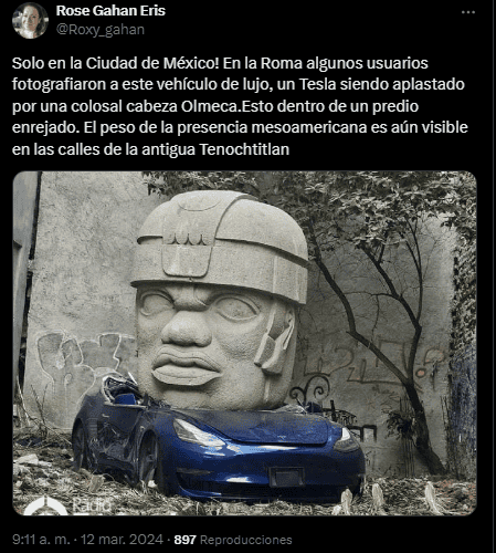 Cuando hablaba del consumismo en la mañanera de hoy, el Presidente Andrés Manuel López Obrador dijo "no tener más de lo necesario", y reconoció la obra de arte en la que una cabeza olmeca aplasta un auto Tesla, de la empresa de Elon Musk, en la colonia Roma de la Ciudad de México.En su conferencia de hoy 18 de marzo en Palacio Nacional, López Obrador hizo referencia al plan artístico concebido hace más de dos años por el escultor Chavis Mármol, de Apan, Hidalgo, que tiene como objetivo explorar reflexiones sobre temas contemporáneos a través de sus mezclas de humor y crítica.Al mencionar que no tiene un carro Tesla, López Obrador reconoció que la obra le gustó."Yo no lo haría porque ni tengo un carro así, pero el mensaje es muy bueno. Hubo una exposición en la Ciudad de México, donde por cierto se está produciendo muy buen arte. Tenemos extraordinarios pintores como Orozco y otros (...)."Hay un carro de estos nuevos, Tesla, para gente con recursos económicos; que no está mal el que tiene, lo que está mal es que tenga un Tesla un político corrupto, eso sí está mal, pero alguien que con trabajo y esfuerzo logró comprar un Tesla, pues merece respeto", expresó.Entre risas, el Presidente describió la caída de la cabeza colosal olmeca sobre el vehículo: "Entonces, a mí el mensaje sí me gustó porque ese es el consumismo y los otros es la cultura, es la cultura milenaria, es lo que viene de lejos, es el México profundo, es la cultura madre, que a partir de esa cultura de desarrollan otras culturas y México, lo que es ahora nuestro país, tiene una gran herencia de estas civilizaciones y eso se ha transmitido de generación en generación y eso es lo que nos hace muy fuertes (...)"."No al consumismo, eso tampoco es felicidad, es lujo barato", declaró.La serie denominada "Neo-Ta Meme" aborda el pasado prehispánico desde una perspectiva neocolonial occidental.Según Chavis Mármol, la obra forma parte de su serie Neo Ta Memes, donde aborda la idea de la cabeza olmeca en un contexto contemporáneo relacionado con los sistemas económicos actuales.La escultura, una réplica de una cabeza colosal olmeca, aplasta un auto Tesla, simbolizando la unión entre dos mundos: la cultura madre y el avance tecnológico.La cabeza colosal, representativa en nuestra herencia cultural, se impone sobre el objeto tecnológico, criticando la priorización de los productos del sistema capitalista sobre nuestros valores ancestrales. La destrucción del Tesla Model 3 por el peso colosal de la escultura, busca resaltar la importancia de nuestra historia y tradiciones frente al consumismo desenfrenado.OF
