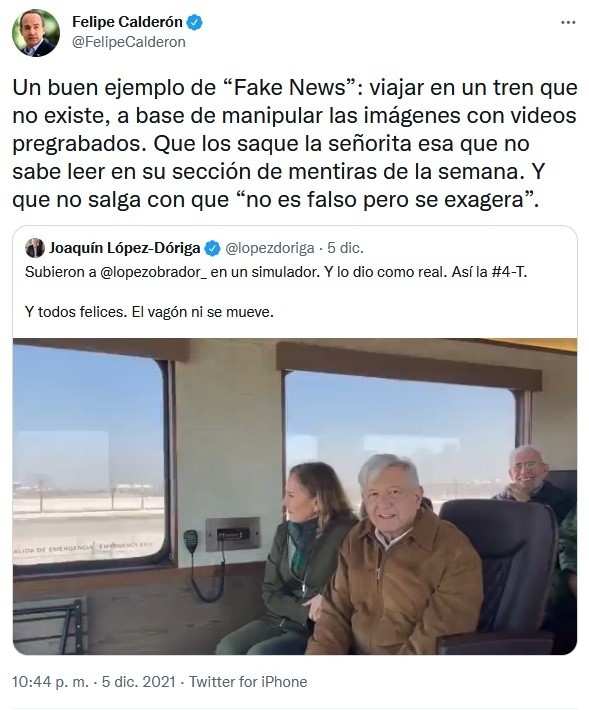 Un video del Presidente Andrés Manuel López Obrador (AMLO) de un recorrido al aeropuerto General Felipe Ángeles, conocido como de Santa Lucía, generó polémica el fin de semana en redes sociales, tras afirmaciones de que el traslado se realizó en un presunto tren simulador. El Gobierno federal respondió hoy al respecto.Elizabeth García Vilchis, encargada de la sección "quién es quién en las mentiras de la semana" en la mañanera del Presidente, dio este miércoles una explicación sobre el tren utilizado el pasado domingo 5 de diciembre. "Estamos ya en el tren del nuevo Aeropuerto General Felipe Ángeles", dijo entonces López Obrador, quien estaba acompañado de su esposa Beatriz Gutiérrez Müller; Claudia Sheinbaum, jefa de Gobierno de la Ciudad de México; Alfredo del Mazo, gobernador del Estado de México, entre otros integrantes de su gabinete.En sus redes sociales, el periodista Joaquín López-Dóriga declaró que a AMLO lo subieron a "un simulador" y el Presidente "lo dio como real'', además que "el vagón ni se mueve".El expresidente Felipe Calderón retomó los dichos de López-Dóriga y pidió a García Vilchis que desmintiera la "fake news" y aclarara si López Obrador viajó "en un tren que no existe, a base de manipular las imágenes con videos pregrabados"."Que los saque la señorita esa que no sabe leer en su sección de mentiras de la semana. Y que no salga con que ‘no es falso pero se exagera’", refirió el expresidente de México.Sin embargo, López-Dóriga corrigió posteriormente su mensaje y admitió que López Obrador no realizó el viaje en un simulador."CORRECCIÓN: No es un simulador. Pero afirma que ‘estamos ya en el tren del nuevo aeropuerto Felipe Ángeles’ y ese tren no existe. No han comenzado ni a construirlo. Y lo aun no explicado: ¿Por qué desaparece la imagen de dicho aeropuerto de la ventanilla? Pero no va en simulador", escribió el periodista.Las publicaciones generaron una ola de comentarios tanto de críticas al Mandatario como defendiéndolo.En la mañanera de este miércoles desde Nayarit, Garcia Vilchis describió que López Obrador, acompañado de una comitiva, realizó un recorrido de supervisión de 8.7 kilómetros por las obras del tren que conectará a la Ciudad de México con el nuevo aeropuerto de Santa Lucía.Además mostró una fotografía del punto donde se subieron al tren y donde se bajaron e hizo referencia a lo publicado en redes por López-Dóriga y por Calderón, "quien además pidió que se presentara el caso en esta sección"."Señor: deseo concedido, pero por mentir. Y creo que en ese tuit hace referencia a mí, pero no por mentir y además está muy pendiente de nuestra sección. Lo felicitamos", respondió García Vilchis al expresidente Calderón.Explicó que Gutiérrez Müller realizó una transmisión en vivo del recorrido en su cuenta de Instagram, en "donde se aprecia el tren en movimiento a través de las ventanas"."También se ven las vías por dentro y por fuera y los acompañantes al recorrido".García Vilchis dijo que se usó un vagón especial de inspección de líneas de Ferromex."Las vías actuales son para el tren de carga, se van a cambiar y se construirán trenes nuevos de pasajeros del Tren Suburbano que sale de la estación Buenavista y cuyo recorrido al Aeropuerto será de 45 minutos", añadió.Describió un video en el que se ve el recorrido que hizo López Obrador en el tren, a 30 kilómetros por hora, con dos paradas y velocidad reducida en varios tramos para observar detalles.Asimismo dio un "tutorial" sobre el uso de dispositivos móviles y cámaras porque el argumento principal en redes sociales es que las ventanas del tren "se veían en blanco y que el supuesto simulador habría fallado pues en el video se aprecia una luz parpadeante". La encargada de la sección "quién es quién en las mentiras de la semana" aseguró que "se trata de un efecto de la cámara que al colocarla en modo manual, el usuario puede elegir cuánta luz desea ver y al ponerlo frente a una cámara a medio día en modo manual, como está grabado el video que publicó el Presidente, lo que enfoca la cámara son los rostros y bloquea el exceso de luz, le invitamos a que lo intente en casa"."En una parte del video se observa cómo el tren va avanzando al lado de una pared y nosotros les preguntamos: ¿Si había una pared qué querían ver?", dijo.IM