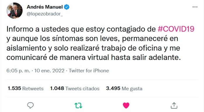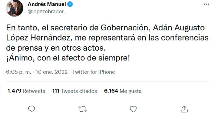 La tarde de este lunes, el Presidente Andrés Manuel López Obrador (AMLO) confirmó a través de sus redes sociales que dio positivo a COVID por segunda vez; asegura que sus síntomas son leves y estará trabajando a distancia."Informo a ustedes que estoy contagiado de #COVID19 y aunque los síntomas son leves, permaneceré en aislamiento y solo realizaré trabajo de oficina y me comunicaré de manera virtual hasta salir adelante", se lee en el tuit.Aunque el Presidente estará aislado en lo que se recupera de la enfermedad, las conferencias de prensa matutinas continuarán, aunque él no esté presente."El secretario de Gobernación, Adán Augusto López Hernández, me representará en las conferencias de prensa y en otros actos", se lee en uno de los tuits de AMLO, confirmando de esta manera que sus mañaneras siguen en pie, ahora presididas por el titular de la Segob.JM