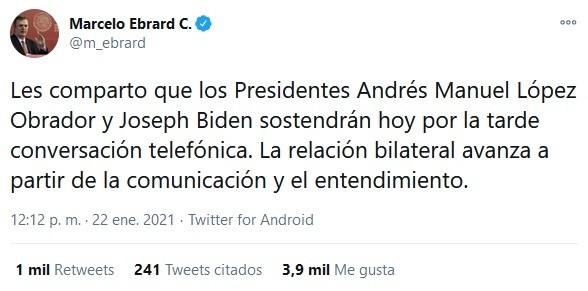 El Presidente Andrés Manuel López Obrador (AMLO), y su homólogo estadounidense, Joe Biden, mantendrán este viernes por la tarde su primera conversación telefónica desde que el demócrata asumió el poder el pasado miércoles.Marcelo Ebrard, titular de la Secretaría de Relaciones Exteriores (SRE), anunció en Twitter: "Les comparto que los presidentes Andrés Manuel López Obrador y Joseph Biden sostendrán hoy por la tarde conversación telefónica. La relación bilateral avanza a partir de la comunicación y el entendimiento".Jen Psaki, portavoz de la Casa Blanca, confirmó después en su rueda de prensa diaria que Biden conversaría esta tarde con López Obrador, después de hablar con el primer ministro canadiense, Justin Trudeau, que será el primer líder extranjero al que llama desde que llegó al poder.Este contacto telefónico se llevará a cabo un día después de que López Obrador asegurara en su conferencia de prensa matutina que no hacía falta una llamada entre mandatarios dado que funcionarios de alto nivel de ambos gobiernos "ya están enlazados"."No hace falta, le deseamos lo mejor y con nosotros no va a haber problema. Lo sabe y nosotros sabemos que no vamos a tener ningún problema con su Gobierno", expresó el mexicano.López Obrador, que conoció a Biden en 2012 cuando este era vicepresidente de Estados Unidos, ya habló por teléfono con el demócrata el pasado 19 de diciembre después de que fuera declarado presidente electo."Reafirmamos el compromiso de trabajar juntos por el bienestar de nuestros pueblos y naciones", reveló entonces López Obrador en sus redes.Desde que Biden asumió definitivamente el poder el pasado miércoles, López Obrador ha expresado en varias ocasiones que coincide con los "planteamientos principales" del demócrata, especialmente en materia migratoria, y ha celebrado la suspensión de la construcción del muro fronterizo.AMLO también ha augurado una "buena relación" con el gobierno de Biden a pesar de que tardó más de un mes en felicitar al estadounidense por su victoria electoral frente a Donald Trump, con quien López Obrador mantuvo una buena sintonía.OA