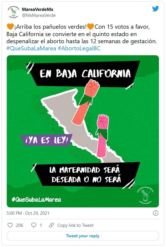 El Congreso de Baja California aprobó este viernes una iniciativa de ley que permite la interrupción legal del embarazo hasta las 12 semanas de gestación y con ello se convirtió en el quinto estado en el país en permitir esta práctica."¡Baja California! Todos los derechos para todas las personas. Hasta que la dignidad y la igualdad se vuelvan costumbre", celebró en su cuenta de Twitter Arturo Zaldívar, presidente de la Suprema Corte de Justicia de la Nación.Con 15 votos a favor, siete en contra y una abstención, Baja California se unió a la Ciudad de México, Oaxaca, Veracruz e Hidalgo como los únicos de los 32 estados en el país que permiten la interrupción del embarazo hasta las 12 semanas sin importar la causa.En el resto del país se permite por violación y algunos estados tienen causales por viabilidad del feto, salud de la madre y pobreza extrema.La noticia fue bien recibida por organizaciones que han impulsado la agenda a favor del derecho de las mujeres a decidir sobre sus cuerpos."¡Baja California hace historia! Hoy se suma a la lista de entidades que despenalizan el aborto hasta las 12 semanas de gestación. Felicidades a todas las colectivas feministas por su incansable trabajo a favor del derecho a decidir de las mujeres y personas con capacidad de gestar", señaló el Grupo de Información en Reproducción Elegida (GIRE)."¡Es ley! En Baja California se aprueba la despenalización del aborto hasta las 12,6 semanas de gestación. Ahora es el quinto estado del país en ampliar los derechos de las mujeres y personas con capacidad de gestar. Qué suba la marea", publicó en redes el Instituto de Liderazgo Simone de Beauvoir, especializado en perspectiva de género y derechos humanos.JM