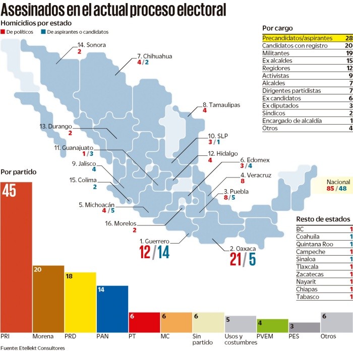La violencia política registrada en el proceso electoral actual no tiene comparación con comicios anteriores. Los niveles alcanzados son históricos, consideran especialistas. Con el asesinato de Javier Ureña, encargado de la alcaldía de Buenavista, Michoacán, suman 133 políticos, incluidos 48 candidatos, que han sido ultimados en 26 estados hasta el cierre de campañas.A pocos días de las elecciones, la consultoría Etellekt, especializada en riesgos políticos, advierte que los ataques contra políticos se han intensificado en las dos últimas semanas del proceso electoral, principalmente en entidades del litoral del Pacífico, que concentran 68 de los 133 homicidios; con 26 casos cada uno, Guerrero y Oaxaca encabezan la lista, seguidos de Puebla, con 13 víctimas; Michoacán, con nueve, y Veracruz, con ocho. Por partido, los más golpeados por asesinatos de políticos han sido el PRI (45), Morena (20) y PRD (18).De acuerdo con el ex consejero presidente del IFE, Luis Carlos Ugalde, en ningún otro proceso electoral se ha registrado una violencia política similar; no obstante, asegura que estos ataques no buscan "intimidar a votantes, sino a candidatos para que permitan la libre acción de las bandas delictivas en sus gobiernos". Asegura que la elección no está en riesgo, sino la autonomía de las nuevas administraciones.El director de Etellekt, Rubén Salazar, argumenta que la concurrencia de elecciones locales con la federal puede considerarse como una de las razones que explican el nivel de violencia actual.Datos de la consultoría muestran que en los comicios de 2011-2012, en el que se disputaron mil 967 cargos, incluidas siete gubernaturas, 565 diputaciones y 766 alcaldías, se registró el asesinato de nueve políticos, uno de ellos aspirante a un puesto de elección, mientras que en el proceso actual, donde se juegan tres mil 223 cargos locales y federales, incluidas mil 613 alcaldías, van 133 víctimas.GC