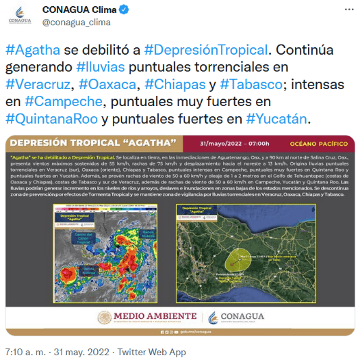 La Comisión Nacional de Agua (Conagua) informó la mañana de este martes que "Agatha" se debilitó a depresión tropical tras tocar tierra en Oaxaca.Este martes, el centro de "Agatha" se desplazará sobre el sur de Veracruz y mantendrá condiciones para lluvias puntuales torrenciales en Veracruz (sur), Oaxaca (oriente), Chiapas y Tabasco.También se prevén lluvias fuertes a intensas que podrían generar deslaves e inundaciones en el sureste mexicano y en la Península de Yucatán.Habrá vientos fuertes con rachas de 50 a 60 km/h y oleaje de 1 a 2 metros de altura significativa en el Golfo de Tehuantepec (costas de Oaxaca y Chiapas, además de Tabasco y sur de Veracruz.Por otra parte, una línea seca, sobre el norte de México, en combinación con un canal de baja presión, sobre la Mesa del Norte y Mesa Central, producirán chubascos, lluvias fuertes y descargas eléctricas en dichas regiones, además de vientos con rachas de 60 a 70 km/h y tolvaneras en Chihuahua, Coahuila, Nuevo León, Tamaulipas, San Luis Potosí, Zacatecas y Durango. Finalmente, se pronostica ambiente cálido a caluroso en gran parte del país, con temperaturas superiores a los 40 °C en Sonora, Chihuahua, Coahuila, Nuevo León y Sinaloa.GC