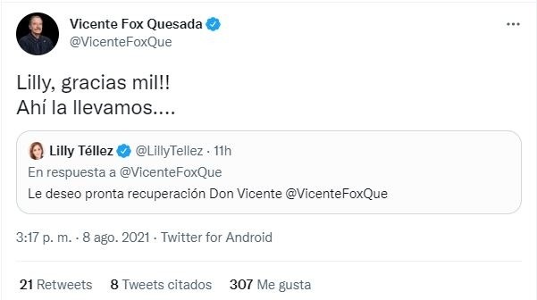 Desde una cama de hospital en la que recibe atención por haber dado positivo a COVID-19, el expresidente Vicente Fox mantiene comunicación en sus redes sociales. Incluso halagó la imagen de un pan que la senadora Lily Téllez publicó en Twitter."¡Humm!... con helado de vainilla. Aunque aquí en el hospital no lo sirven!!", posteó el exmandatario.La legisladora respondió a Fox deseándole pronta recuperación. "Lily, gracias mil!! Ahí la llevamos...", expresó el expresidente.Vicente Fox y su esposa Marta Sahagún son atendidos en el Hospital Ángeles de la ciudad de León, al que ingresaron el viernes pasado por dar positivo a COVID-19.Fox comenzó a tuitear desde las primeras horas de este domingo y estuvo atento a diversas publicaciones y en respuesta a los buenos deseos para su recuperación. Si te interesó esta noticia y quieres saber más, entonces descarga y descubre INFORMAPlus, la aplicación digital de EL INFORMADOR, en donde tenemos contenidos exclusivos, seleccionados por nuestros editores, para darles una experiencia más completa a los lectores. Descarga la aplicación y pruébala GRATIS por treinta días. Para iOS: https://apple.co/35jaVgbPara Android: https://bit.ly/3gwVSEVSi eres suscriptor de EL INFORMADOR tu acceso está incluido, solicítalo al 33 3678-7777JL