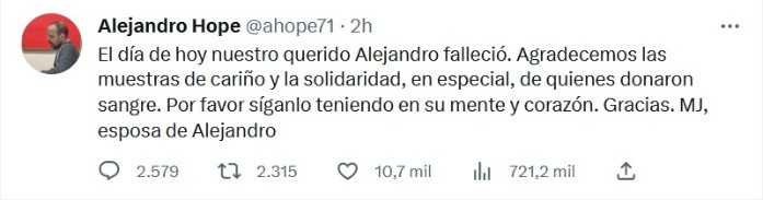 El analista de seguridad y columnista Alejandro Hope, falleció este viernes, confirmaron sus familiares este viernes."El día de hoy nuestro querido Alejandro falleció. Agradecemos las muestras de cariño y la solidaridad, en especial, de quienes donaron sangre. Por favor síganlo teniendo en su mente y corazón. Gracias. MJ, esposa de Alejandro", se tuiteó desde su cuenta personal esta mañana.Ayer jueves, familiares y amigos pedían donadores de sangre para Hope, quien se encontraba en el Hospital Español debido a una intervención quirúrgica.En entrevista con Ciro Gómez Leyva en Radio Fórmula, David Aponte dijo que Hope era "correcto, preciso, discreto, muy querido en el circuito de analistas de seguridad"."Perdemos a un hombre valioso en el terreno de la seguridad, pero muy entrañable para nosotros", dijo Aponte.De igual manera, diversas organizaciones, políticos, periodistas y otras personalidades de la sociedad civil externaron su pésame a los familiares de Alejandro Hope.Hope fue Director del Proyecto MC2 y un destacado analista de seguridad con su columna "Plata o Plomo".Además de su labor periodística, Hope tuvo diversos cargos en el Centro de Investigación y Seguridad Nacional (CISEN). Fue consultor de Grupo de Economistas y Asociados, en temas políticos y económicos.Durante la campaña política de Vicente Fox en el 2000, Hope formó parte del equipo de asesores de Adolfo Aguilar Zínser.Hope tenía estudios de licenciatura en la Universidad de Pennsylvania y de doctorado en la Universidad de Princeton.JM