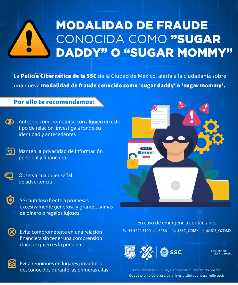 De acuerdo con información de la Secretaría de Seguridad Ciudadana (SSC), los elementos de la policía cibernética han detectado un fenómeno que se caracteriza por una dependencia financiera donde personas económicamente establecidas, denominados "sugar daddies" o "sugar mommies", brindan apoyo financiero o regalos a parejas más jóvenes, sin embargo, detrás de esta aparente generosidad pueden esconderse riesgos de estafas y fraudes.Los estafadores aprovechan la vulnerabilidad de aquellos que buscan este tipo de relaciones de personas jóvenes y atractivas en redes sociales o en aplicaciones de citas y a través de identidades falsas, fotos manipuladas y perfiles ficticios sociales atraen a sus víctimas.Una vez que el "Suggar" se encuentra enganchado, solicitan dinero por adelantado con falsos argumentos o engañan sobre su capacidad financiera y usualmente utilizan temas personales y familiares para bajar la guardia y así poder realizar el fraude.Para evitar convertirse en víctima de estas estafas, los especialistas de la Policía Cibernética indican recomendaciones digitales:* * * Mantente al día con las noticias, únete a nuestro canal de Whatsapp * * *OB