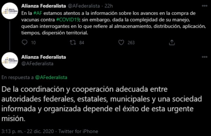 Los 10 gobernadores de la Alianza Federalista insistieron en su petición al gobierno del Presidente Andrés Manuel López Obrador de que haya total transparencia en la estrategia de vacunación contra el COVID-19.En un mensaje publicado en redes sociales, los gobernadores aliancistas recordaron que este miércoles arribaron sólo tres mil vacunas contra coronavirus, para un país de 127 millones de habitantes.Agregaron que su reclamo se justifica hoy más que nunca, pues México exige certidumbre."Desde hace semanas la #AF ha solicitado al @GobiernoMX total transparencia en la estrategia de vacunación #COVID19; hoy arribaron sólo tres mil dosis ¡para un país de 127 millones de habitantes! Nuestro reclamo se justifica hoy más que nunca: #México exige certidumbre", destacaron los gobernadores aliancistas.OF