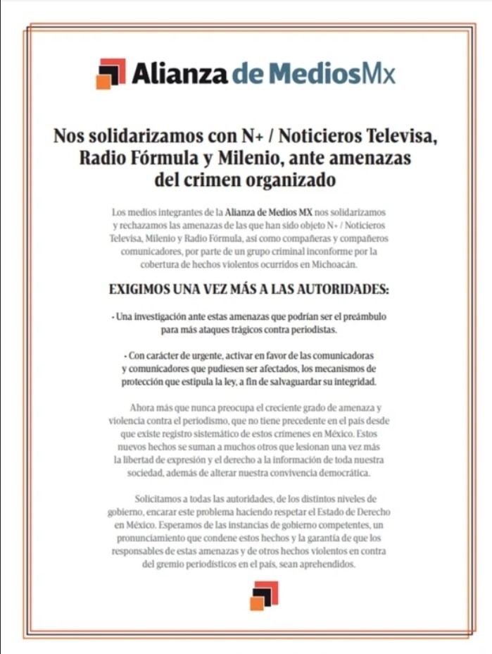 La tarde de este lunes, los medios integrantes de la Alianza de Medios MX, entre los cuales está EL INFORMADOR, mostraron apoyo y solidaridad a Noticieros Televisa, Radio Fórmula y Milenio. Esto, tras las amenazas recibidas por parte del crimen organizado.Mediante un comunicado, la Alianza de Medios rechazó las amenazas del grupo criminal tras hechos ocurridos en Michoacán."Los medios integrantes de la Alianza de Medios MX nos solidarizamos y rechazamos las amenazas de las que han sido objeto N+ / Noticieros Televisa, Milenio y Radio Fórmula, así como compañeras y compañeros comunicadores, por parte de un grupo criminal inconforme por la cobertura de hechos violentos ocurridos en Michoacán".Asimismo, la organización exigió a las autoridades una investigación, pues aseveró que las amenazas recibidas "podrían ser el preámbulo para más ataques trágicos contra periodistas".Por ello, pidieron los medios integrantes activar los mecanismos de protección para las comunicadores y comunicadoras. "Con carácter de urgente, activar en favor de las comunicadoras y comunicadores que pudiesen ser afectados, los mecanismos de protección que estipula la ley, a fin de salvaguardar su integridad"."Ahora más que nunca preocupa el creciente grado de amenaza y violencia contra el periodismo, que no tiene precedente en el país desde que existe registro sistemático de estos crímenes en México. Estos nuevos hechos se suman a muchos otros que lesionan una vez más la libertad de expresión y el derecho a la información de toda nuestra sociedad, además de alterar nuestra convivencia democrática", añadió el informe.Finalmente, el desplegado agregó estar a la espera de una respuesta por parte de los distintos niveles de gobierno, quienes condenen los hechos ocurridos contra el gremio periodístico."Solicitamos a todas las autoridades, de los distintos niveles de gobierno, encarar este problema haciendo respetar el Estado de Derecho en México. Esperamos de las instancias de gobierno competentes, un pronunciamiento que condene estos hechos y la garantía de que los responsables de estas amenazas y de otros hechos violentos en contra del gremio periodísticos en el país, sean aprehendidos", concluyó el oficio.JM