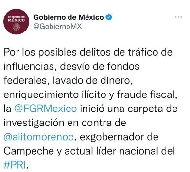 Este viernes, a través de su cuenta de Twitter, el Gobierno federal dio a conocer que Alejandro Moreno ‘Alito’, también exgobernador de Campeche, será investigado por los posibles delitos de tráfico de influencias, desvío de fondos federales, lavado de dinero, enriquecimiento ilícito y fraude fiscal.La Fiscalía General de la República inició una carpeta de investigación en contra de Alejandro Moreno Cárdenas, líder nacional del Partido Revolucionario Institucional (PRI).Sin embargo, minutos después la autoridad borró la publicación que hizo en Twitter.Mientras tanto, Alejandro Moreno era electo vicepresidente Mundial de la Internacional Socialista (IS), una organización que agrupa a partidos socialdemócratas, socialistas y laboristas de todos los continentes.En plena crisis al interior del PRI donde expresidentes han pedido su renuncia y con la filtración de llamadas telefónicas que exponen supuestos actos de corrupción, "Alito" fue nombrado como líder de dicha organización en Ginebra, Suiza. En el marco de la reunión mundial de la IS, que se celebra en esa ciudad, Alejandro Moreno denunció la persecución política que ejerce el Gobierno mexicano sobre los opositores, después de que se rechazó su propuesta de reforma eléctrica en el Congreso.Con información de El Universal.