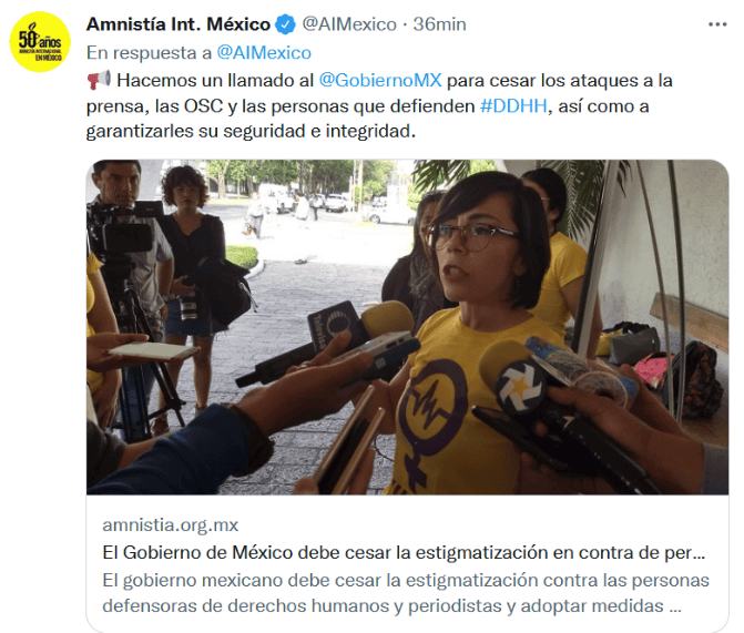 La respuesta que emitió el Gobierno del Presidente de México, Andrés Manuel López Obrador (AMLO) al Parlamento Europeo sobre su posicionamiento por los asesinatos en el país, ha causado mucha indignación, y ahora la organización Amnistía Internacional lamentó dicha respuesta."Lamentamos la respuesta del Estado Mexicano frente a la resolución que, lejos de reconocer el grave riesgo que enfrentan personas defensoras de derechos humanos y periodistas, debilita las alianzas y desconoce la relación de estrecha cooperación que se ha mantenido por años con las instituciones de la Unión Europea", dijo Amnistía en un comunicado firmado por varias ONG.Las organizaciones firmantes se sumaron así "al llamado del Parlamento Europeo" y exigieron "al Estado mexicano honrar sus obligaciones internacionales, fortaleciendo el Estado de derecho y haciendo cumplir los marcos normativos que las organizaciones de la sociedad civil hemos impulsado".Este jueves, el Parlamento Europeo (PE) condenó las amenazas, el acoso y el asesinato de periodistas y defensores de los derechos humanos en México e instó a que estos crímenes -que ya han acabado con la vida de seis reporteros en lo que va de 2022- se investiguen de manera "rápida, exhaustiva, independiente e imparcial.La resolución fue aprobada por 607 votos a favor, dos en contra y 73 abstenciones.En respuesta, el Presidente de México, Andrés Manuel López Obrador (AMLO) escribió una dura carta en la que califica de "borregos" a los eurodiputados y denunció "la corrupción, hipocresía e injerencismo" del Parlamento Europeo.Este viernes, en rueda de prensa, AMLO agregó: "Estos señores, legisladores europeos, muy conservadores, con mentalidad colonialista, aprueban una resolución condenando al Gobierno de México. Antes, como México tenía gobernantes sin autoridad moral, se tenían que quedar callados y cualquiera ninguneaba a las autoridades mexicanas".Las ONG firmantes -entre ellas Artículo 19 y la Organización Mundial Contra la Tortura (OMCT)- lamentaron "las grandes deficiencias por parte de las autoridades mexicanas para proteger la vida e integridad de personas defensoras y periodistas".Por ello, pidieron "investigar y sancionar a quienes resulten responsables de los delitos que se cometen en su contra"."Es urgente que el Estado adopte una política pública de protección integral que genere un entorno seguro y propicio para la defensa de derechos humanos, proteja eficaz y adecuadamente a este grupo poblacional", agregó el texto.México es uno de los países más peligrosos para el ejercicio del periodismo en el mundo.Desde el año 2000 hasta la fecha, la organización Artículo 19 ha documentado 151 asesinatos de periodistas en México (138 hombres y 12 mujeres) con relación a su labor.Un total de 47 se registraron durante el mandato anterior del presidente Enrique Peña Nieto (2012-2018) y 31 en el actual de López Obrador (2018-2024).GC