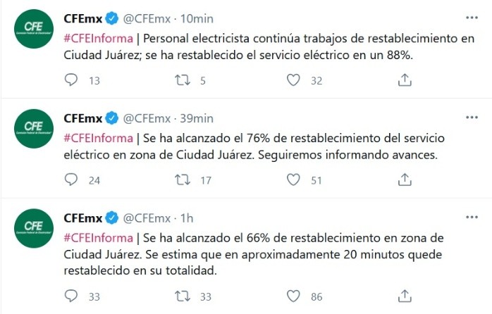 La Comisión Federal de Electricidad (CFE) informó este jueves que, por una falla en la subestación eléctrica Moctezuma, se interrumpió el suministro de energía eléctrica en Ciudad Juárez, Chihuahua.Por medio de su cuenta oficial de Twitter, la CFE detalló que se ha restablecido el suministro al 20% de los usuarios afectados; sin embargo, prevé que en una hora más se alcance el 100 por ciento; conforme pasaron los minutos fue actualizando el restablecimiento al 88 por ciento.Por su parte, el Centro Nacional de Control de Energía (Cenace) detalló en redes sociales que a las 16:48 horas ocurrió la falla, por lo que se afectaron aproximadamente 525 MW de carga correspondientes a usuarios de Ciudad Juárez, "al salir de operación alrededor de mil 470 MW de generación".Ambas instituciones dieron a conocer que ya se activaron, coordinadamente, los protocolos de restablecimiento de energía eléctrica en la zona.A tres meses del apagón en el norte del país, provocado por la falta de gas, Ciudad Juárez cayó en caos al quedarse este día sin energía eléctrica, telefonía celular y agua potable en algunos puntos.Alrededor de las 15:30 horas, comenzaron los apagones en diferentes zonas de la ciudad hasta volverse generalizados.El caos de automovilistas en la calles sin semáforos de manera sorpresiva fue más que evidente, en tanto que a través de WhastApp se informaba que la señal de telefonía para celular también estaba interrumpida en gran parte de la frontera.El apagón provocó también problemas de abastecimiento de agua en algunas colonias, ya que se utiliza la energía para bombear el líquido.JM