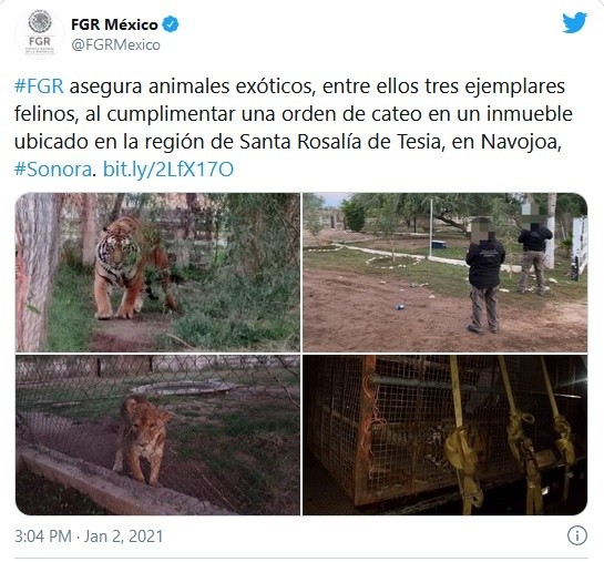 Una leona y dos tigres de bengala, así como siete cabezas de ganado vacuno y ocho cabezas de ganado equino, fueron aseguradas por la Fiscalía General de la República (FGR) al cumplimentar una orden de cateo en el municipio de Navojoa, Sonora.Con apoyo de personal de la Secretaría de la Defensa Nacional (Sedena), y de Servicios Periciales de la FGR, elementos de la Policía Federal Ministerial (PFM) aseguraron los mencionados animales en un inmueble ubicado en la región de Santa Rosalía de Tesia, perteneciente a Navojoa.Además de los animales, el personal de seguridad también aseguró 324 casquillos percutidos de proyectil de arma de fuego, así como seis vehículos.Lo asegurado quedó a disposición del Ministerio Público Federal (MPF), quien llevó a cabo los trámites legales correspondientes.JM