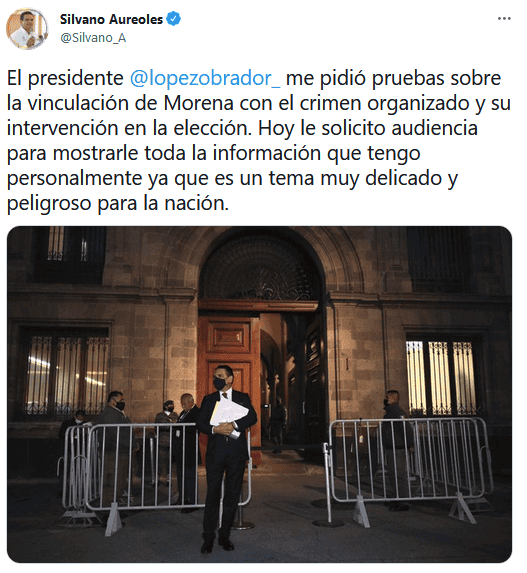 Silvano Aureoles, gobernador de Michoacán, se encuentra este martes por la mañana afuera de Palacio Nacional para entregar las pruebas al presidente Andrés Manuel López Obrador que, asegura, vinculan a Morena con el crimen organizado y su intervención en la pasada elección en ese estado.En su cuenta de Twitter, el gobernador michoacano afirmó que compartir esta información pone en riesgo su vida, "y es algo que usted no permitiría en ninguna circunstancia" y señaló que el "Ejecutivo federal es humanista y entiende lo que digo".En la puerta de la calle Moneda, Silvano Aureoles espera a que le permitan el paso al recinto histórico para entregar las supuestas pruebas, que demuestran, indica, que Morena se convirtió en un instrumento del narcotráfico."El presidente López Obrador me pidió pruebas sobre la vinculación de Morena con el crimen organizado y su intervención en la elección. Hoy le solicito audiencia para mostrarle toda la información que tengo personalmente ya que es un tema muy delicado y peligroso para la nación"."Todos sabemos que compartir esta información abiertamente pondría en riesgo la vida de las personas y eso es algo que usted no permitiría en ninguna circunstancia. Sé que el presidente es un humanista y entiende lo que digo", escribió en la red social.El pasado 24 de junio, luego de que Silvano Aureoles, declarara que el crimen favoreció a Morena en las pasadas elecciones del 6 de junio, AMLO señaló que si el gobernador tiene pruebas, que las presente.En su conferencia matutina en Palacio Nacional, López Obrador refirió que no tiene información de que el crimen haya tenido intromisión en las elecciones de Michoacán."Lo más importante es que se presenten pruebas porque si no, son noticias sensacionalistas, amarillismo y eso es bastante", declaró AMLO.En entrevista con Ciro Gómez Leyva, Aureoles aseguró el pasado miércoles que el crimen organizado en la entidad favoreció a Morena en pasadas elecciones, donde ganó Alfredo Ramírez Bedolla."Si se confirma lo que hoy está sucediendo, el crimen organizado va a poner otra vez al gobernador. Alfredo Ramírez Bedolla representará al crimen organizado en Michoacán, ellos lo pusieron", señaló Aureoles."De los 14 municipios, controlados por el crimen organizado, Morena gana en 13", agregó.GC