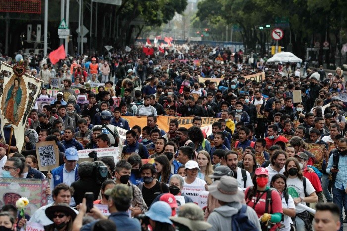 La tarde de este lunes, familiares de los 43 estudiantes de Ayotzinapa desaparecidos en 2014 participaron en la enésima marcha para exigir justicia esta vez con sentimientos encontrados.Aunque el gobierno parece avanzar, también retrocede debido a "guerras internas" dentro de una administración, encabezada por Andrés Manuel López Obrador, que "sucumbe al poder militar", denunciaron en un manifiesto leído tras la marcha."Hay muchas cosas encontradas", comentó con una rosa en la mano Clemente Rodríguez, padre de uno de los jóvenes de la Normal Rural de Ayotzinapa que hace ocho años fueron atacados por distintas fuerzas de seguridad y autoridades coludidas con el crimen organizado en Guerrero."A veces nos dan una información, sí vamos a actuar, pero luego patinamos en lo mismo". Y lo mismo es la falta de respuestas sobre que pasó realmente esa noche en la localidad de Iguala y cuál fue el destino final de los jóvenes porque el anterior gobierno ocultó la verdad y el actual sólo les ha ofrecido "avances parciales", dijo Hilda Legideño, una de las mamás al leer el manifiesto.Los manifestantes pidieron acabar con la impunidad e investigar y castigar a los militares que se les compruebe que están involucrados en el caso.“Peña Nieto nunca dijo que los militares eran los responsables... los llevaron al Batallón 27 en Iguala, Guerrero y derribamos la mentira de Jesús Murillo, exprocurador General de la República actualmente detenido, exigimos que castiguen a los militares no solamente de delincuencia organizada, también de desaparición forzada”, aseveró Blanca Nava, Madre del normalista Jorge Álvarez."Se habla de la muerte de nuestros hijos pero no nos muestran prueba", afirmó. Y es cierto. Sólo se encontraron restos de tres de ellos, uno de Christian Alfonso, el hijo de Rodríguez.En las últimas semanas, la Comisión de la Verdad calificó el caso de "crimen de Estado" porque según indicó autoridades de todos los niveles de gobierno estuvieron involucradas en las desapariciones y su encubrimiento y ofreció nuevos datos que confirmaban la participación del Ejército en los hechos.También hubo detenciones importantes de tres militares, entre ellos un mando en la zona y ahora general retirado, y la del ex procurador general Jesús Murillo Karam, acusado de manipular una versión a base de torturas.Pero algunas sentencias absolutorias, la filtración a un diario nacional de datos del informe de la Comisión que no se dieron a conocer a las familias o la anulación de 21 órdenes de captura, 16 de ellas de militares, por parte de la fiscalía federal —, ha indignado a los padres algunos de los cuales pidieron durante la marcha la renuncia del fiscal general Alejandro Gertz Manero."Jueces y ministerios públicos sucumben ante el poder militar", denunciaron en el manifiesto leído sobre una pancarta con la frase "El ejército lo sabe, Ayotzinapa resiste".Rodríguez subrayó que se advirtió claramente a las autoridades que si todavía tenían funcionarios del gobierno anterior que los despidan "para que esto pueda avanzar y haya una verdad donde nos convenzan".El Presidente Andrés Manuel López Obrador dijo por la mañana que se investigará esa polémica medida y admitió que "hay diferencias" en esa institución aunque no profundizó sobre ese punto. "Esto no quita que la investigación continúe", agregó.El Centro Prodh, la ONG de derechos humanos encargada de representar legalmente a las familias de los estudiantes, calificó ese tipo de actuaciones como muy inusuales y preocupantes. La fiscalía no ha hecho comentarios al respecto.El punto más delicado sigue siendo el Ejército, la institución contra la que los padres arremeten desde hace ocho años."Siempre estuvimos señalando a los cuarteles militares y vamos a llegar a las últimas consecuencias", insistió Rodríguez.Por eso las exigencias de verdad y justicia y el grito de "fue el ejército" volvieron a recorrer el centro de la capital, blindada ante la posibilidad de disturbios que fueron menores y esporádicos tras actos más radicales de las últimas semanas.López Obrador aseguró que los militares detenidos deberán asumir su responsabilidad pero sostuvo que "eso no significa que es toda la institución la responsable" y volvió a respaldar a las fuerzas armadas, a quienes ha multiplicado el poder y las funciones en los cuatro años que lleva en el gobierno.También dijo que el Ejército ha colaborado con la investigación del caso aunque los abogados de las familias afirman que ha sido de forma limitada aunque supieron en tiempo real todo lo que sucedía.El presidente de la Comisión de la Verdad Alejandro Encinas dijo además que presuntamente fue el general detenido quien habría ordenado matar a algunos de los muchachos.