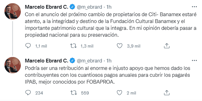 A una semana del anuncio de la venta de Banamex, el secretario de Relaciones Exteriores, Marcelo Ebrard consideró que el patrimonio de la Fundación Cultural del banco "debería pasar a propiedad nacional" con el fin de conservar su acervo. En un mensaje a través de Twitter, Ebrard señaló que se mantendrá al tanto de "la integridad y destino de la Fundación Cultural Banamex y el importante patrimonio cultural que la integra".El pasado 11 de enero, el director corporativo de desarrollo institucional, estudios económicos y comunicación de Citibanamex, Alberto Gómez Alcalá detalló que la venta de Banamex incluye la marca, Afore, acervo cultural y el crédito en México.Fomento Cultural Banamex (o Citibanamex como se llama desde 2001) posee inmuebles históricos en varias ciudades del país –el Palacio de Iturbide, el Foro Valparaíso, en el Centro Histórico de la Ciudad de México; las casas de Cultura del Mayorazgo de La Canal, en San Miguel de Allende; el palacio del Conde del Valle de Súchil, en Durango; el Museo Casa Montejo, en Yucatán.Además, Citibanamex guarda una de las colecciones de arte mexicano más notables e importantes –con obras de artistas como Diego Rivera, María Izquierdo, José María Velasco; algunos de estos artistas tienen declaratoria de Monumento Artístico. El recién inaugurado Foro Valparaíso, en el Centro Histórico, exhibe parte de esa colección, una exposición permanente conformada por 117 pinturas de artistas como David Alfaro Siqueiros, Diego Rivera, Remedios Varo, José María Velasco, Leonora Carrington, Julio Ruelas, Frida Kahlo y José Clemente Orozco, entre otros.GC