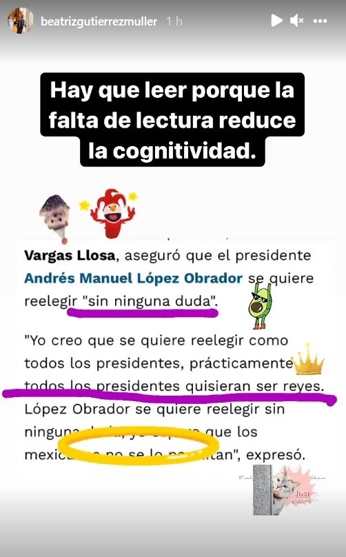 Luego de que el Nobel de Literatura peruano, Mario Vargas Llosa, aseguró que el Presidente Andrés Manuel López Obrador (AMLO) se quiere reelegir, Beatriz Gutiérrez Müller, esposa del Mandatario, reaccionó en Instagram."Yo creo que se quiere reelegir como todos los presidentes, prácticamente todos los presidentes quisieran ser reyes. López Obrador se quiere reelegir sin ninguna duda, yo espero que los mexicanos no se lo permitan", expresó Vargas Llosa en entrevista con el periodista Carlos Loret de Mola para Latinus, difundida ayer.La esposa de López Obrador y escritora publicó en una historia de su cuenta de Instagram fragmentos de los dichos del escritor y agregó emojis y un texto."Hay que leer porque la falta de lectura reduce la cognitividad", escribió Gutiérrez Müller, quien acompañó una captura de la entrevista con imágenes de un bufón, una corona y un gato enojado.No es la primera vez que Gutiérrez Müller critica a premios Nobel. En 2019 se valió de su cuenta de Facebook su preocupación ante cómo ideologías de ganadores del Premio Nobel pueden hacer retroceder a América Latina.Aunque entonces no nombró a Vargas Llosa, el escritor reaccionó a esa crítica y le agradeció "que haya sido tan severa en sus críticas hacia mí".En la entrevista con Latinus, Vargas Llosa calificó al Presidente López Obrador de populista y lamentó que pidiera a España disculpas sobre la Conquista en México."Ha demostrado que es un populista, no me diga que no es cómico, absurdo. A estas alturas pedirle a España que pague los costos de lo que fue la Conquista de México, es algo completamente disparatado, no tiene ni pies ni cabeza", sostuvo ante Loret de Mola.Clasificó al populismo como una exageración; "es un hombre que utiliza imágenes fácilmente adulterables, un oportunista", expresó.Al ser cuestionado si México va en camino a una dictadura, Vargas Llosa respondió que no, ya que en la última elección en el país se demostró una "toma de conciencia"."Creo que el contexto mexicano no está para una dictadura, como la que ejercía el PRI, por ejemplo", refirió. Además, criticó que López Obrador invitó al presidente de Cuba, Miguel Díaz-Canel, a conmemorar los 200 años de Independencia en México."Que el Presidente, en los 200 años de Independencia, invite a un presidente cubano a que venga a pronunciar un discurso tampoco tiene mucho sentido, también es una cosa populista, francamente de mal gusto", señaló.IM
