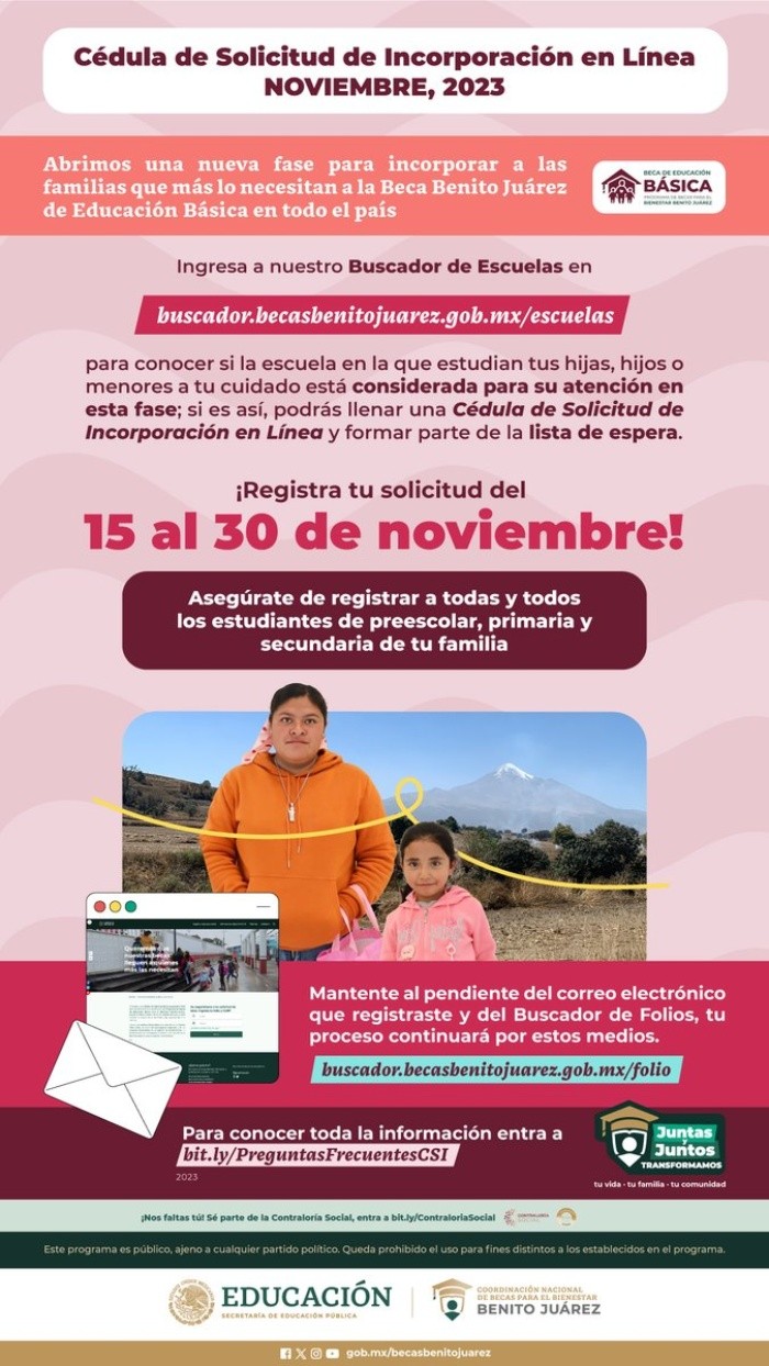 La Beca Benito Juárez es una ayuda mensual de 2 mil 575 pesos, que se otorga por un lapso de 10 meses, para que estudiantes pertenecientes a comunidades vulnerables no abandonen sus estudios.El Gobierno de México ha especificado que tienen especial relevancia los alumnos de zonas marginadas, cuyas escuelas se encuentren en localidades prioritarias -con altos niveles de desigualdad, marginación o pobreza-.Para formar parte del programa, es necesario firmar la Cédula de Solicitud de Incorporación en línea (CSI), y para hacerlo, tan solo necesitas tu Clave Única de Registro de Población (CURP), número de teléfono, y correo electrónico. El registro inició el pasado miércoles 15 de noviembre, y finalizará el 30 de noviembre. Mantente al día con las noticias, únete a nuestro canal de WhatsAppFS